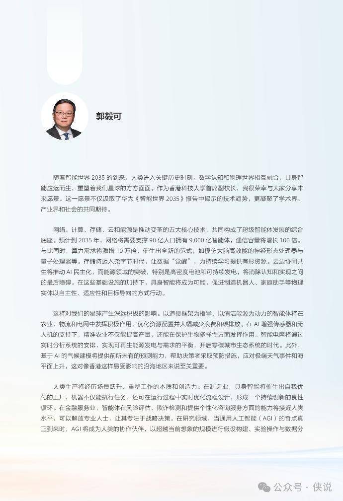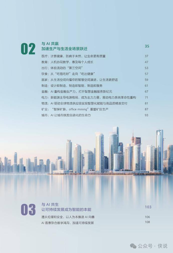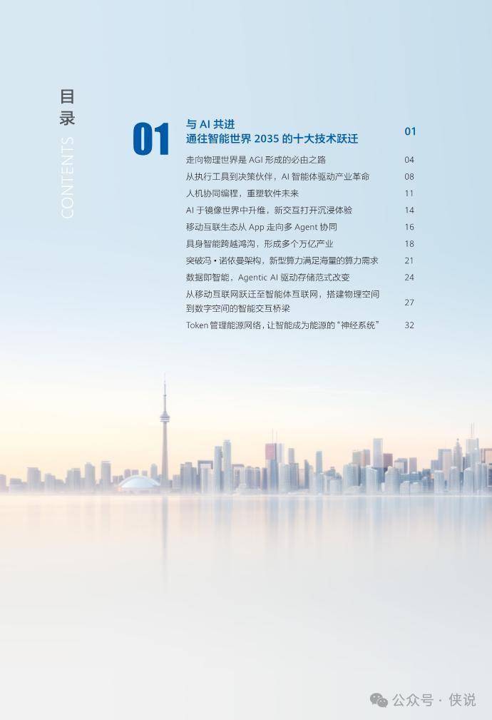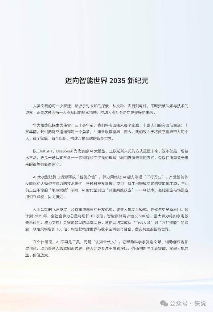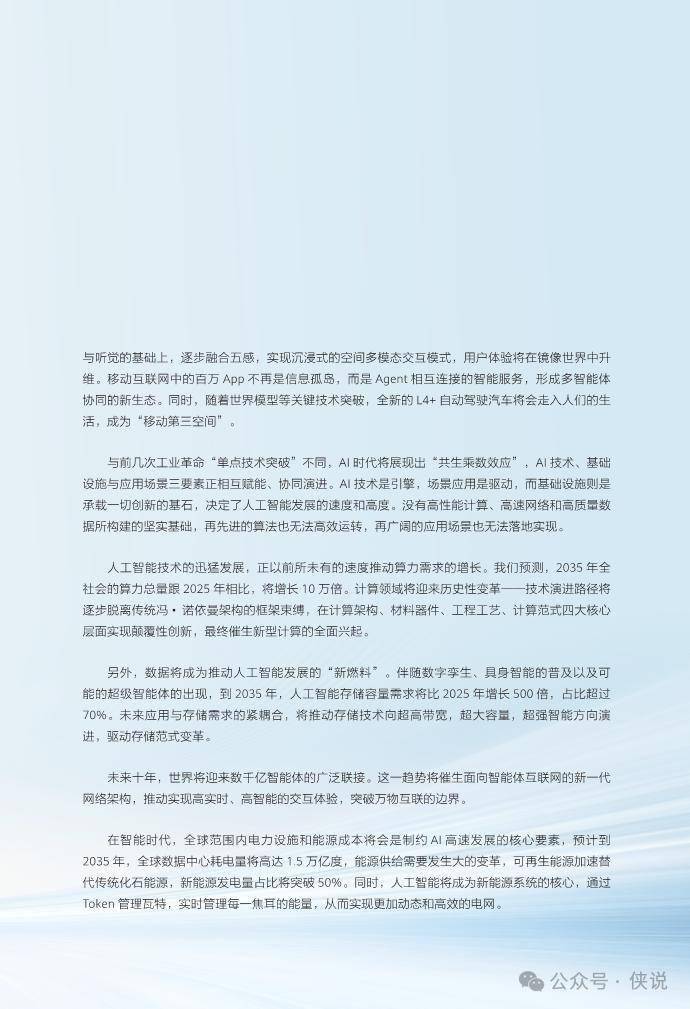 同时,报告详细阐述AI对医疗(从治病到健康全周期管理)、教育(人机协同教学)、出行(L4+自动驾驶)、制造(设计即制造)等生产生活全场景的变革,预测2035年算力需求增长10万倍、智能存储需求增长500倍。