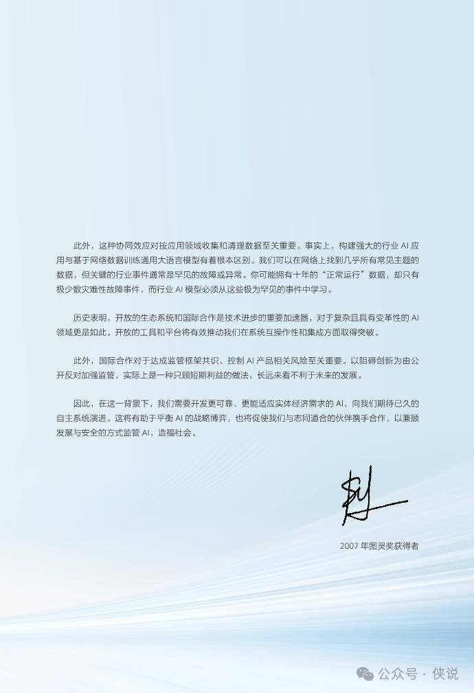 此外,报告强调技术发展需配套伦理安全框架(可解释AI、量子安全)与AI普惠机制,通过国际合作与开放生态,构建以人为本、绿色可持续的智能世界。