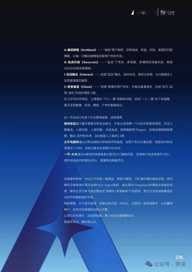 MAGIC方法论以AI为引擎,贯穿用户全生命周期,包含五大环环相扣的环节:发掘需求(Mine),结合全域数据读懂用户真实需求;编排旅程(Architect),定制适配用户阶段的商品、权益等策略;生成内容(Generate),释放AIGC创意潜能产出个性化内容;互动触达(Interact),实现实时对话与陪伴式运营;核查复盘(Check),形成“执行-反馈-进化”的增长闭环。