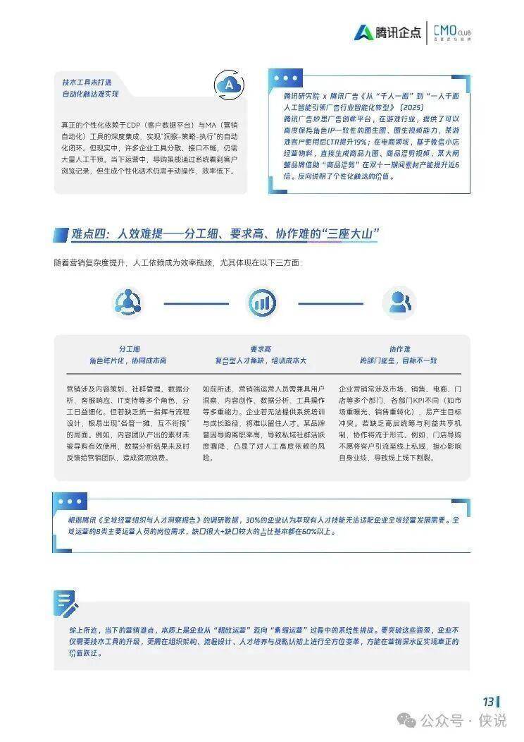 该方法论已在多行业验证成效,如绝味食品全AI组触达-支付转化率是人工组的2.4倍,太平鸟短信支付转化率提升17.59%等。白皮书还分析了2025年企业增长面临的四大困境与四大营销执行难点,阐述AI如何赋能内容生产力与洞察决策力,并给出腾讯企点MAGIC智能营销增长解决方案及具体案例,为企业实现数智化增长提供系统指引。