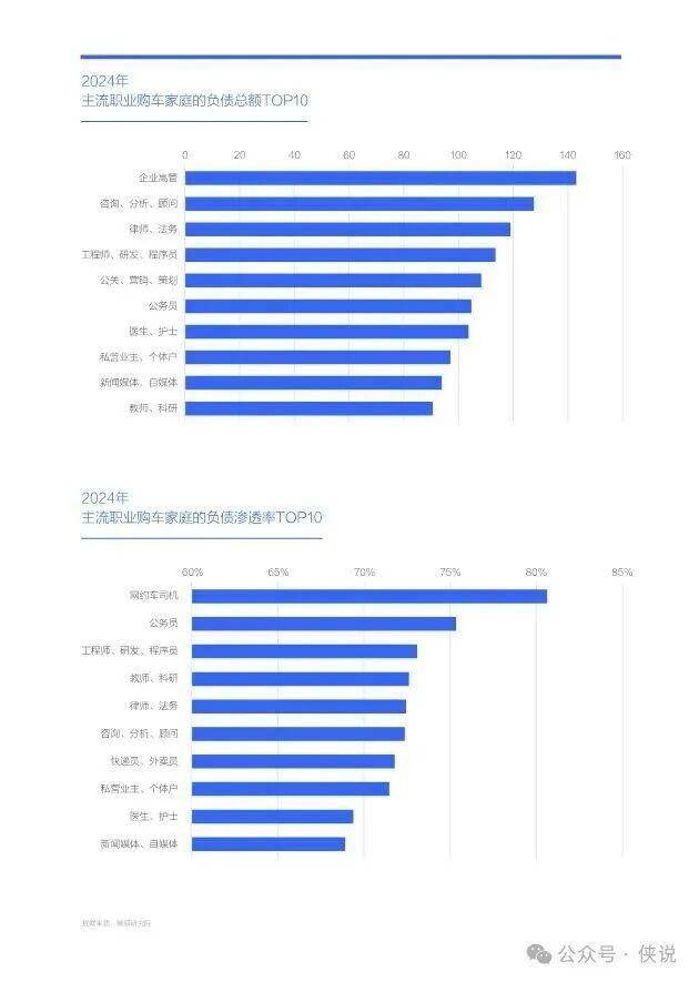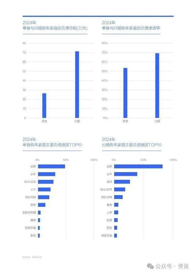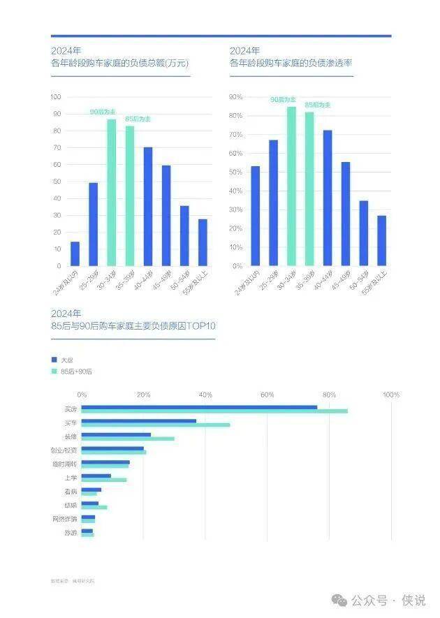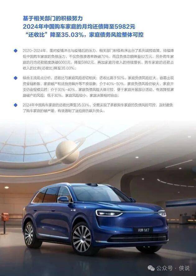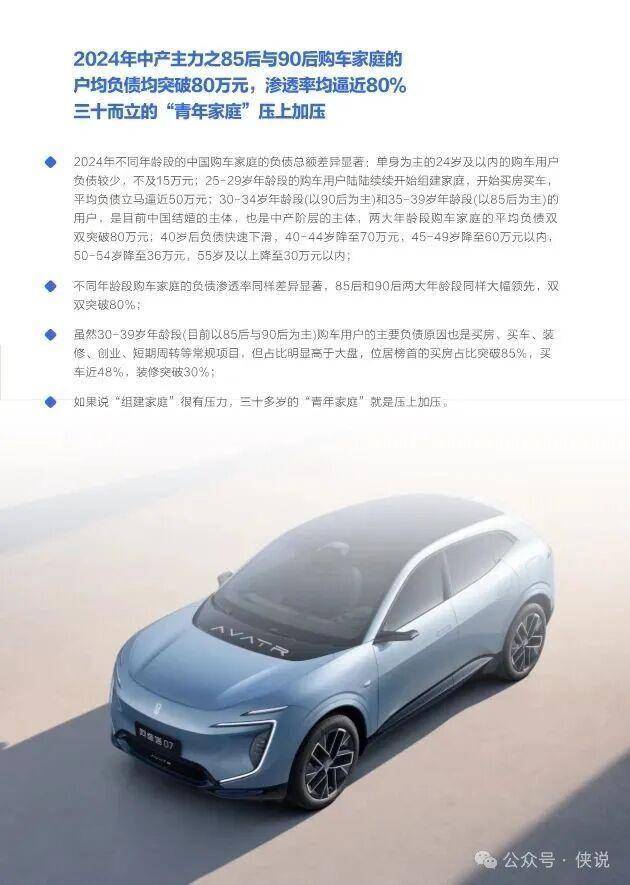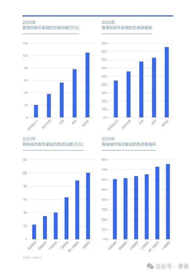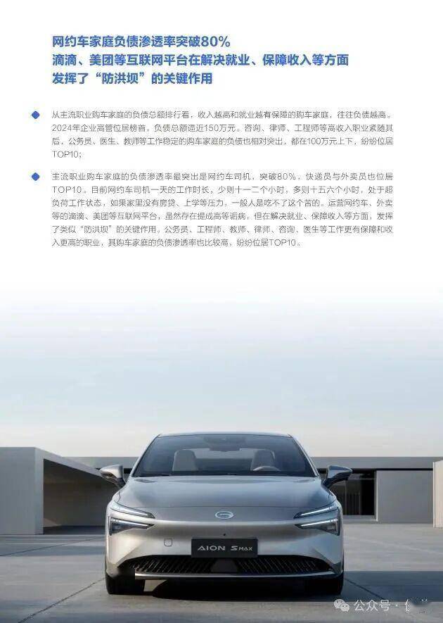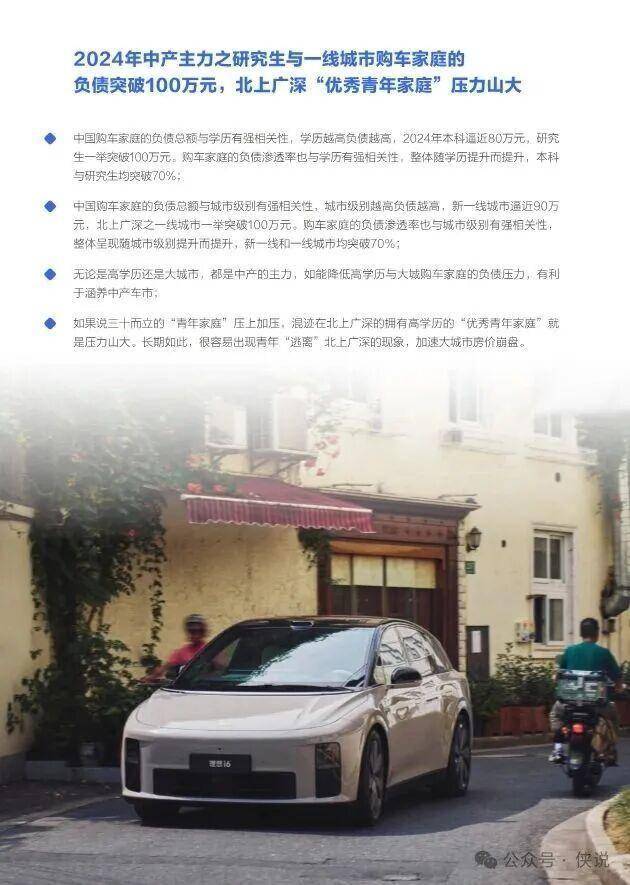从群体特征看,已婚购车家庭户均负债突破70万元,渗透率逼近70%,远高于单身用户的不足30万元;85后、90后为主的30-39岁家庭,户均负债超80万元,渗透率近80%;研究生学历、一线城市购车家庭户均负债更是突破100万元。不过,在政府调控下,2024年购车家庭月均还款降至5982元,“还收比”35.03%,整体债务风险可控。