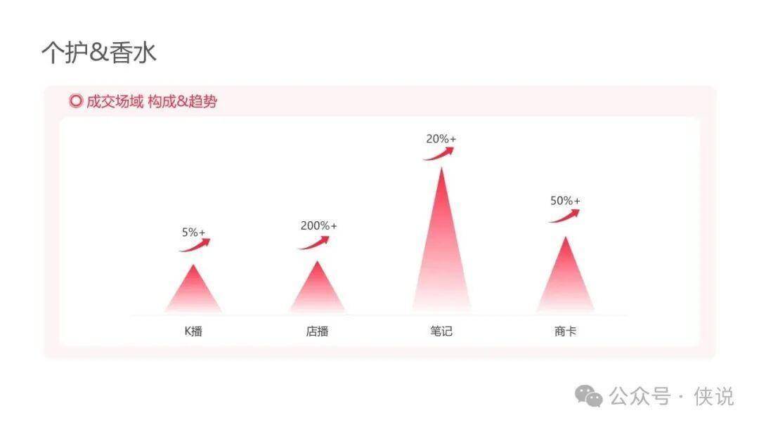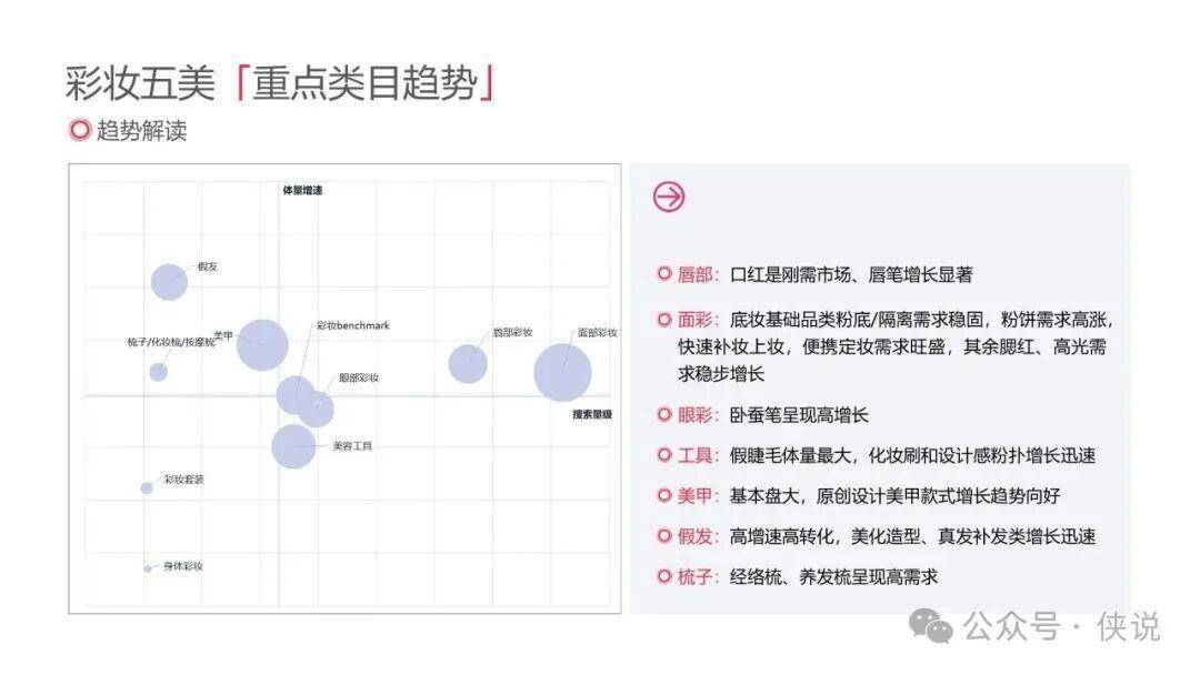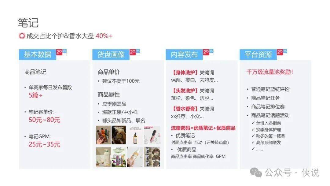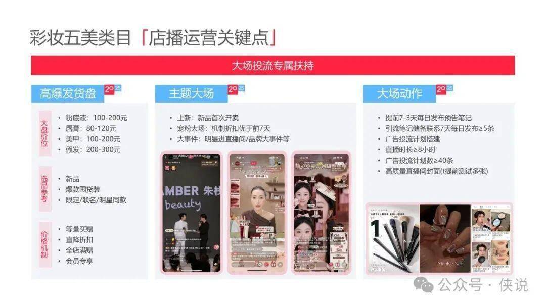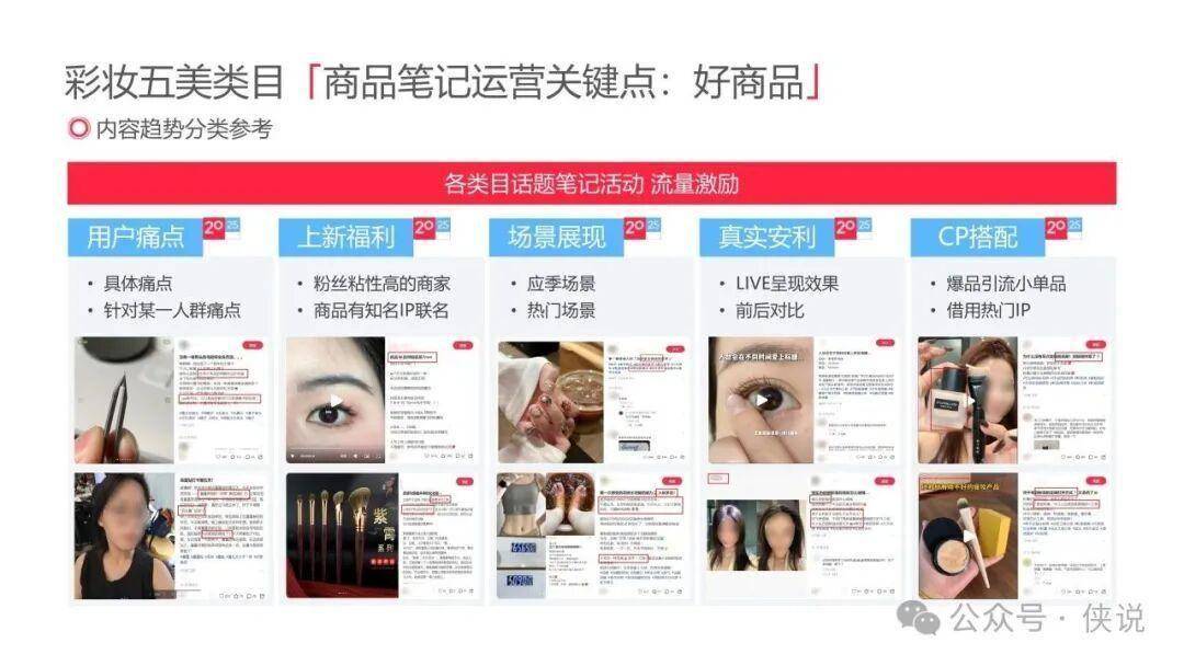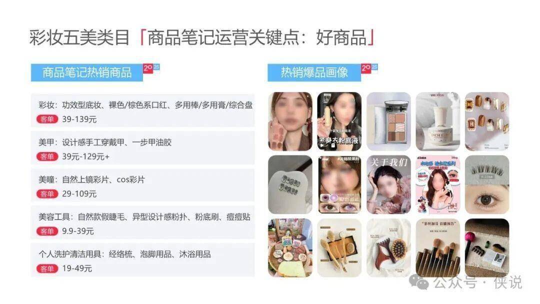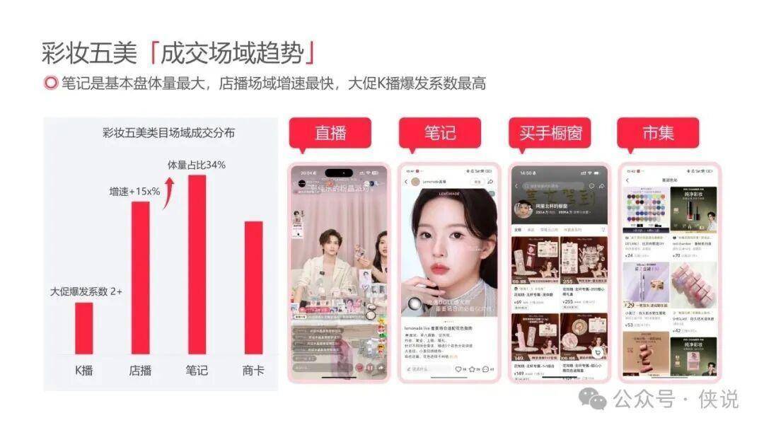 个护&香水领域,头皮护理、手部护理等精细护理品类成搜索热点,笔记成交占比超大盘40%,商品笔记依托千万级流量池支持,成为重要转化载体。彩妆五美板块则以“笔记为基本盘、店播高增速”为特点,唇部口红刚需稳固、眼彩卧蚕笔高增长,假睫毛、 经络梳等工具类需求持续上升。