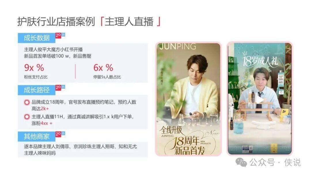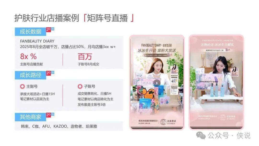 运营案例上,品牌创新玩法频出。 FANBEAUTY DIARY通过“主账号承接大场+子账号侧重转化”的矩阵号店播,2025年8月全店破千万;俊平大魔方主理人直播单场新品首发破100w,粉丝支付占比达9x%。