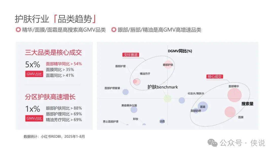 品类层面,各赛道分化明确。护肤行业中,精华、面膜、面霜是高搜索高GMV核心品类,面部精华同比增长超54%;眼部护肤、唇部护理等分区护肤品类增速迅猛,眼部护肤同比增长超88%。