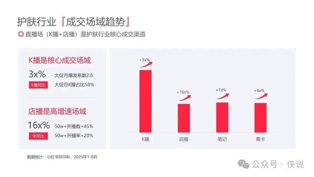 其中,直播场(K播+店播)成为行业核心成交渠道,尤其在护肤领域表现突出——K播作为核心成交场域,大促月占比达58%,爆发系数2.6,同比增长3x%;店播则为高增速场域,年同比增长16x%,开播数与开播率分别提升45%、20%,形成“K播稳盘、店播增量”的格局。