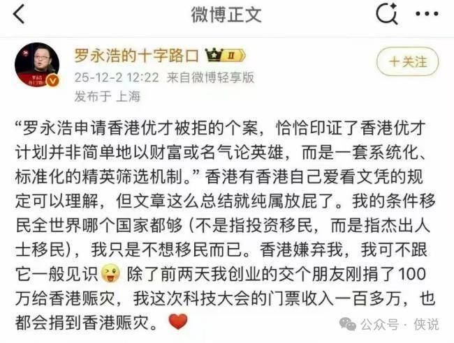 罗永浩被拒后,愤而捐款100万港币。这个行为很"罗氏风格"。