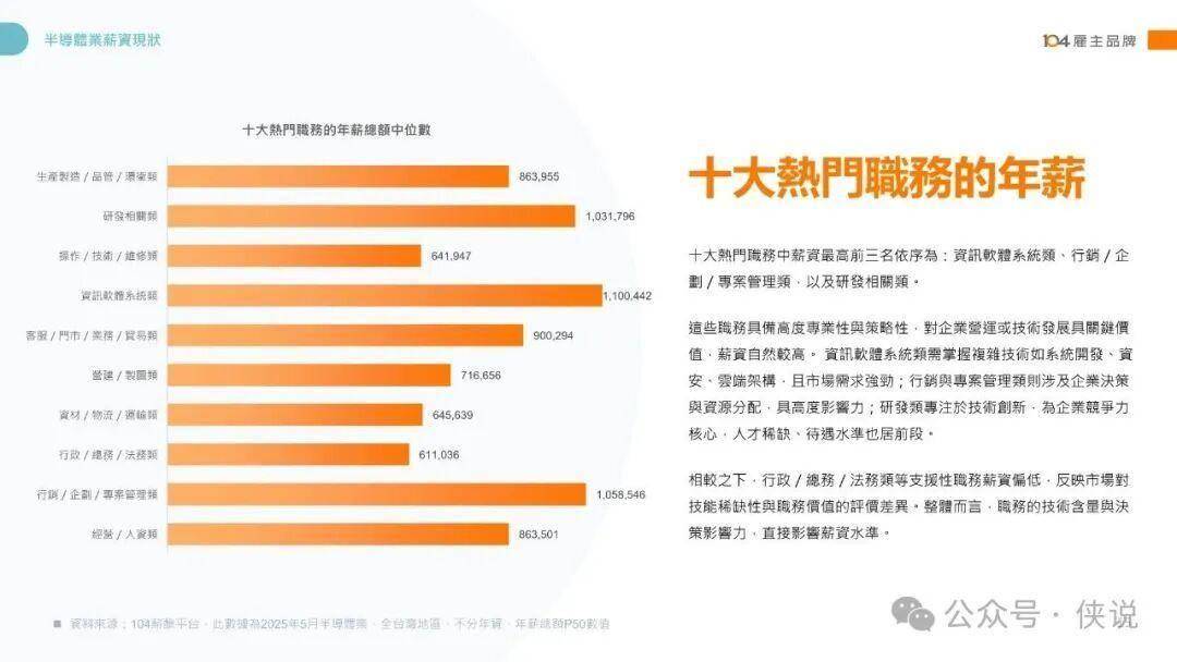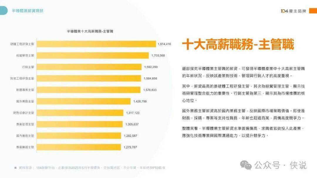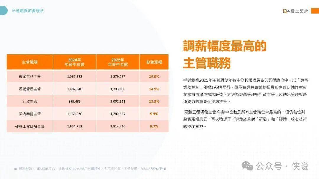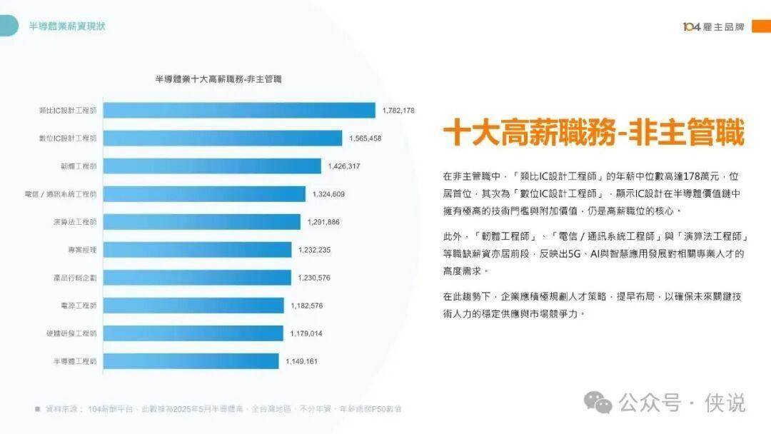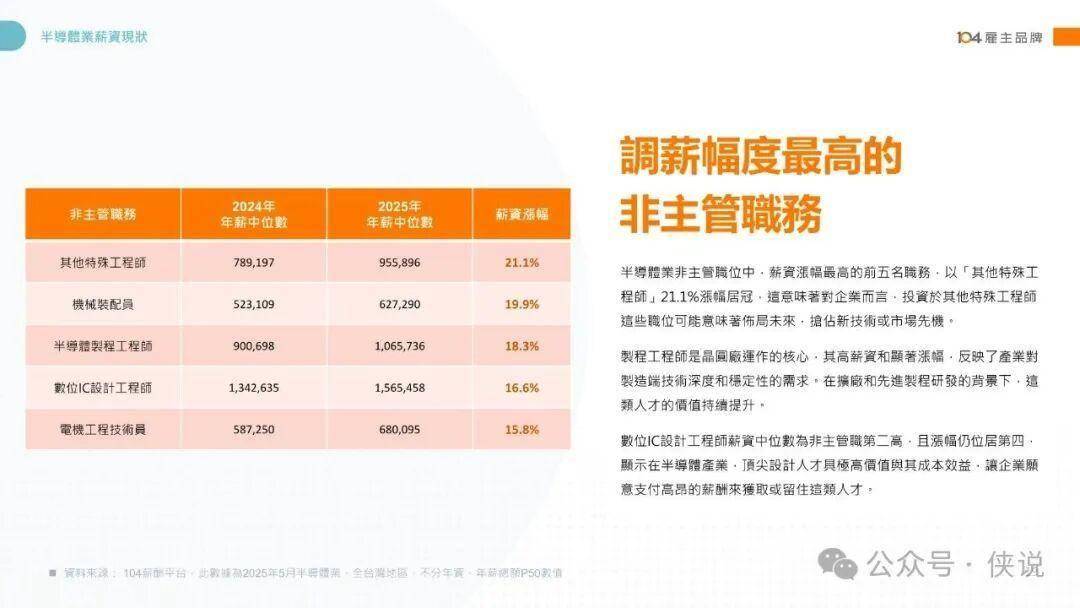 薪资格局方面,技术密集型岗位领跑行业,硬件工程研发主管、类比IC设计工程师、经营管理主管稳居高薪前三,非主管职中类比IC设计工程师年薪中位数高达178万元。2025年主管职中专案业务主管涨幅19.9%,非主管职中其他特殊工程师涨幅21.1%,技术与业务双向强势。