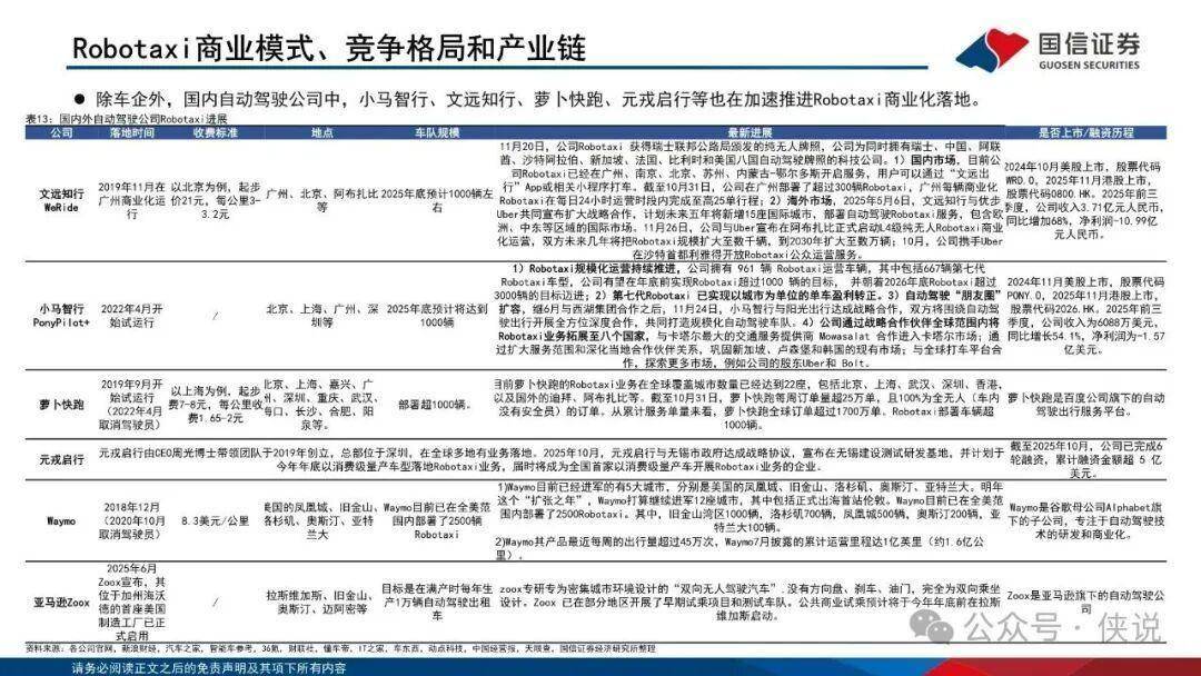 竞争格局呈现“自主厂商崛起+跨界融合”特征:Robotaxi领域文远知行、 小马智行、萝卜快跑商业化加速;Robovan领域九识智能、新石器、 白犀牛订单爆发;产业链层面,数据获取(禾赛科技、速腾聚创)、处理(地平线、黑芝麻智能)、应用(保隆科技、伯特利)等环节龙头企业持续受益。商业模式从“测试运营”向“规模化盈利”转型,无安全员运营成本显著低于传统模式,盈利能力持续提升。