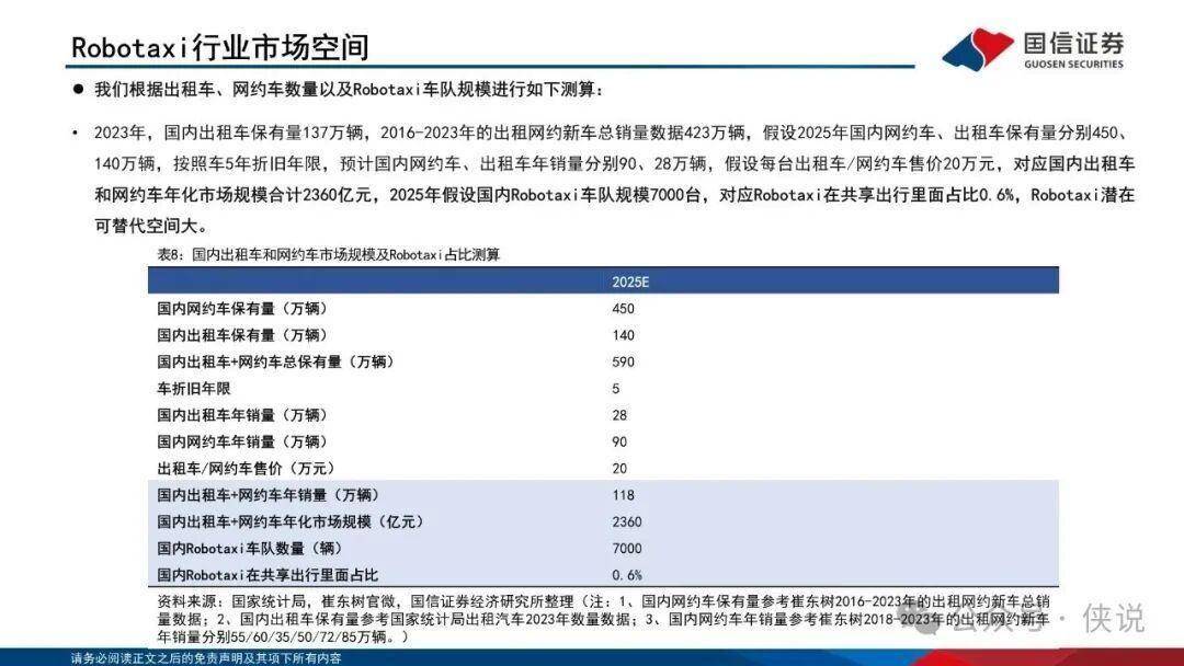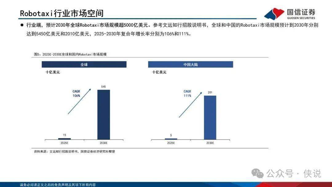 Robo-X涵盖五大核心赛道,市场空间广阔: Robotaxi全球2030年市场规模超5450亿美元,国内出租车+网约车年化市场规模2360亿元;Robovan(无人物流车)国内潜在市场空间1645亿元,2030年全球规模达7840亿美元;Robotruck、 Robobus、Robosweeper分别在干线物流、公共交通、环卫领域形成千亿级市场。