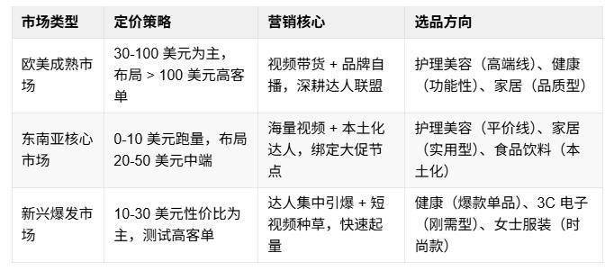 区域差异化:欧美市场需强化品牌力与内容质感,深耕中高端价格带;东南亚需优化供应链效率,在 0-10 美元跑量基础上,挖掘 20-50 美元中端市场潜力;新兴市场需快速切入空白品类,借助达人红利实现早期积累。