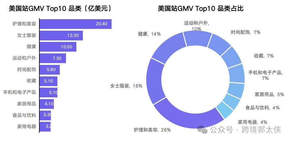 护理美容 + 女士服装占 TOP10 类目近 60%,10-50 美元价格段贡献 56.7% GMV,>100 美元商品占比 14.2%,显示出强劲的高端消费潜力。