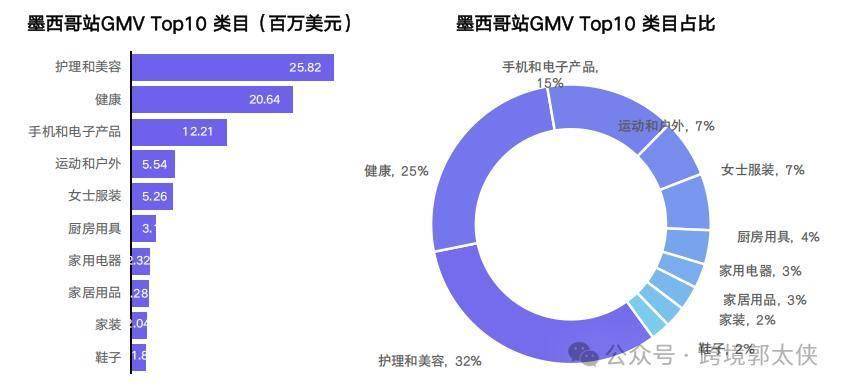 墨西哥站:9000 万美元 GMV,第三季度较第一季度增长 8 倍,达人驱动特征显著(8 月达人达 607 万)。护理美容(32%)+ 健康(25%)为核心,运动户外类目从 1 万美元增长至 134 万美元,增长曲线陡峭。