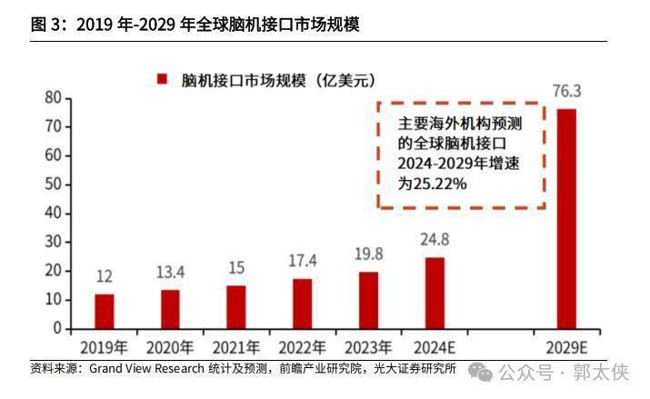 从市场规模来看,全球脑机接口产业从2019年的12亿美元增长至2023年的近20亿美元,复合增长率超13%,预计2029年将达到76.3亿美元,未来5年增速有望保持25%以上。