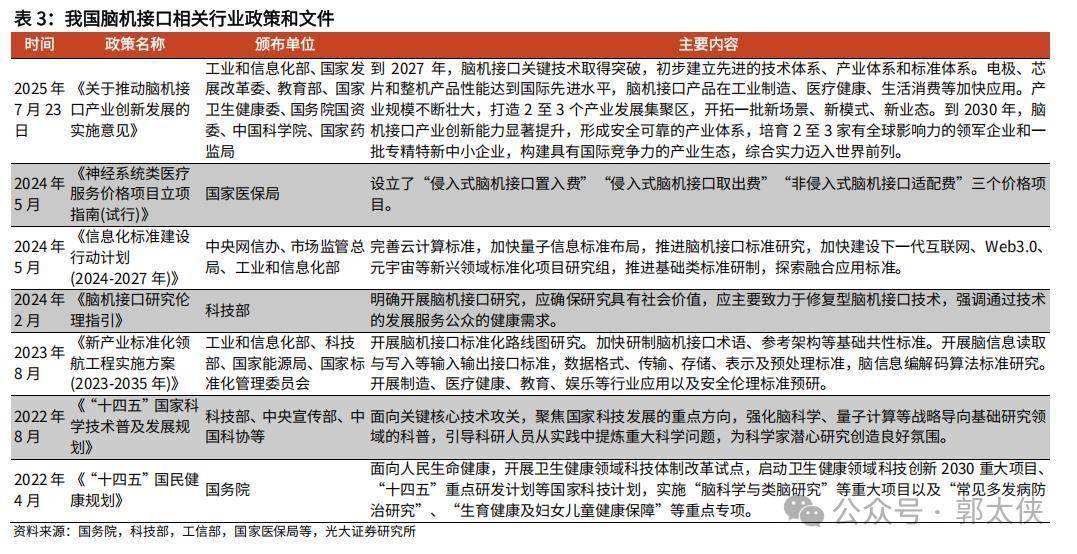 中国已建立“创新器械绿色通道”,脑机接口相关产品可加速注册审批;《脑机接口研究伦理指引》明确实验设计、知情同意、数据隐私等要求;2025年颁布的《采用脑机接口技术的医疗器械术语及定义》,为产业确立了统一的“技术语言”。