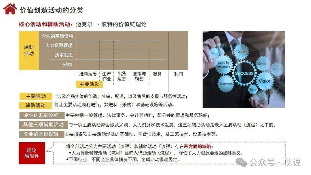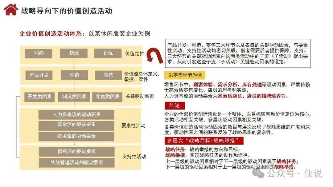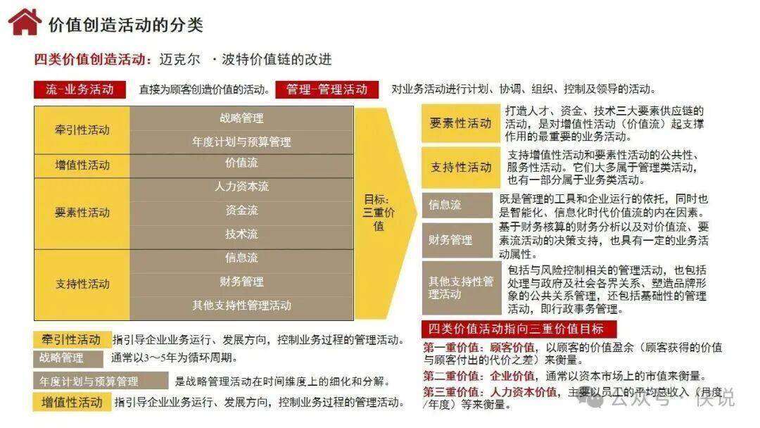 企业价值创造活动以顾客需求为起点和归宿,分为牵引性活动、增值性活动、要素性活动、支持性活动四类,指向顾客价值、企业价值、人力资本价值三重目标。
