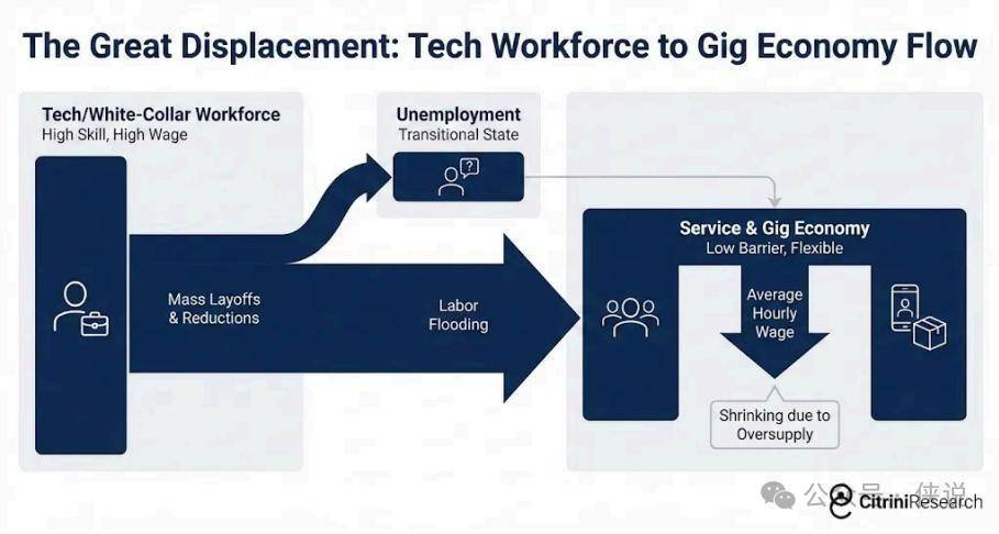 一个没有天然刹车的负反馈循环,就此形成: AI能力提升→企业裁员降本→白领失业/薪资暴跌→消费支出收缩→企业盈利承压→为保利润继续加码AI投入→AI能力进一步提升→更大规模的裁员。