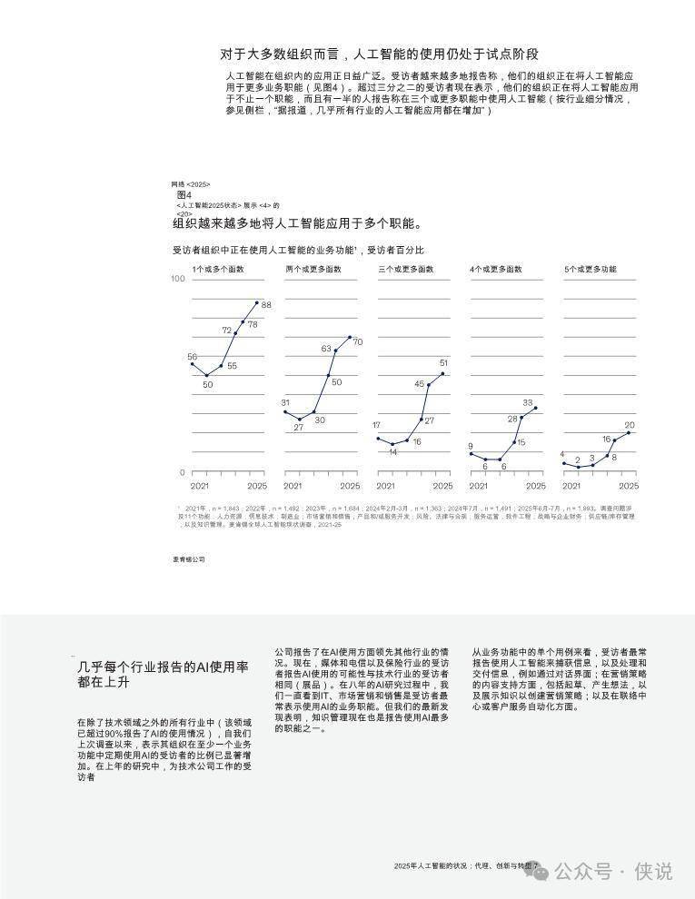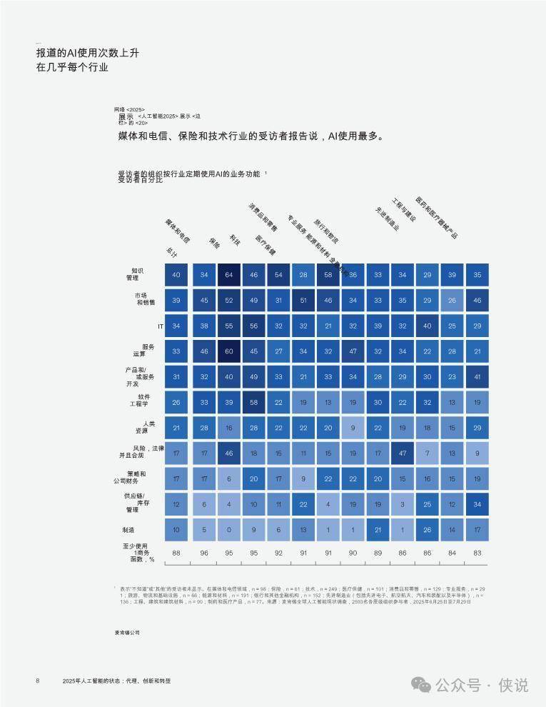 麦肯锡2025年全球调查报告显示,88%的受访者表示其组织已在至少一个业务功能中定期使用人工智能,较去年的78%显著提升,AI应用范围持续扩大,且几乎所有行业的使用率均呈上升趋势。