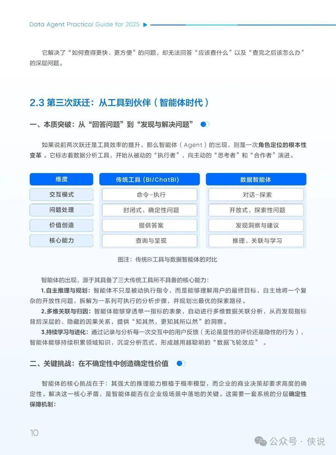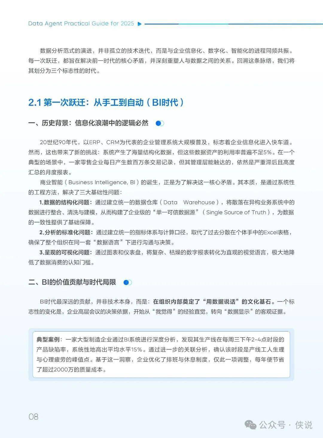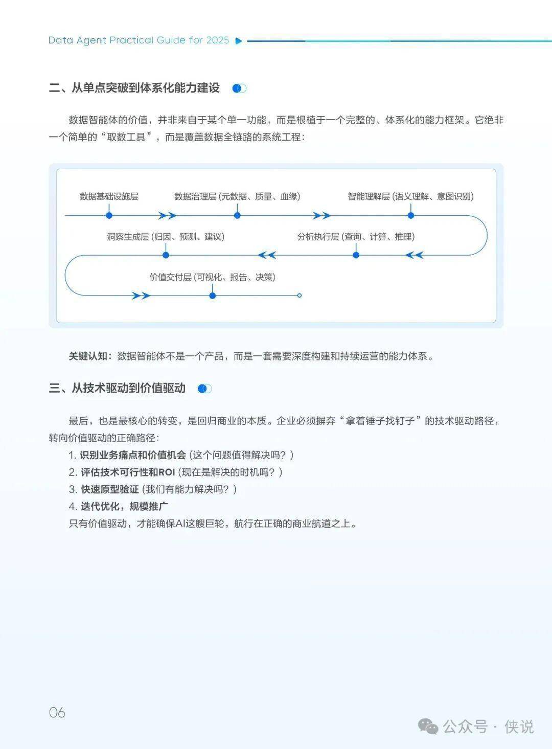 《2025数据智能体实践指南》系统性梳理了数据分析范式的三次跃迁,从BI时代的自动化、 ChatBI时代的普惠化,到智能体时代的伙伴化,构建了数据智能体的能力框架、技术架构与实施路径,为企业在AI时代的数据能力建设提供了务实参考,助力企业实现从技术驱动到价值驱动的转型。
