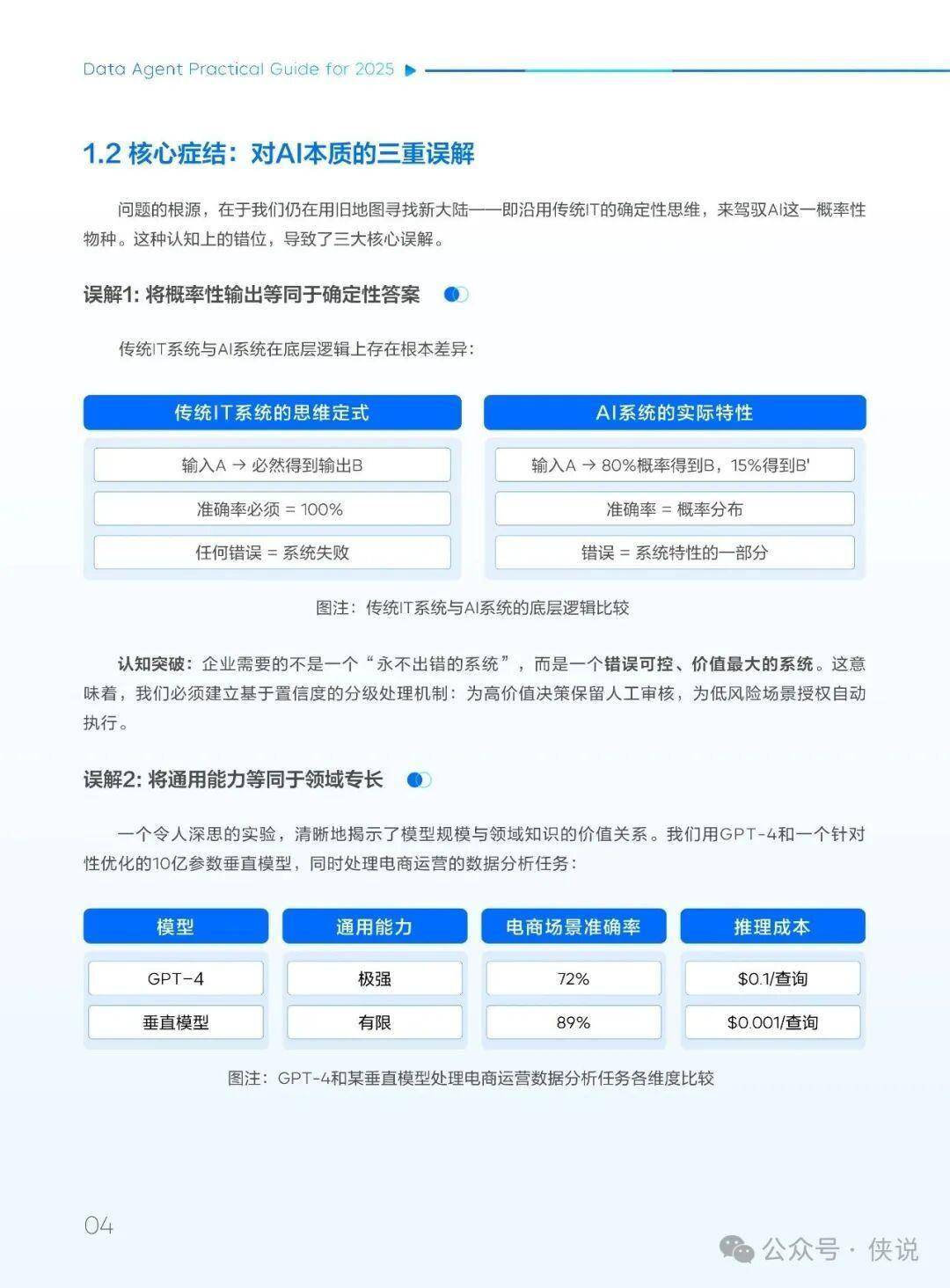 当前,AI领域投资规模庞大,但仅有少数项目能实现清晰正向回报,根源在于企业对AI本质存在认知误区,过度追求技术完美而忽视商业价值。 火山引擎基于大规模实践与深度调研发现,数据智能体的成功关键在于70%的上下文能力与领域知识,而非单纯依赖模型本身;80%的准确率配合高灵活性即可创造10倍价值,且其并非BI的替代品,而是企业“第二决策系统”。