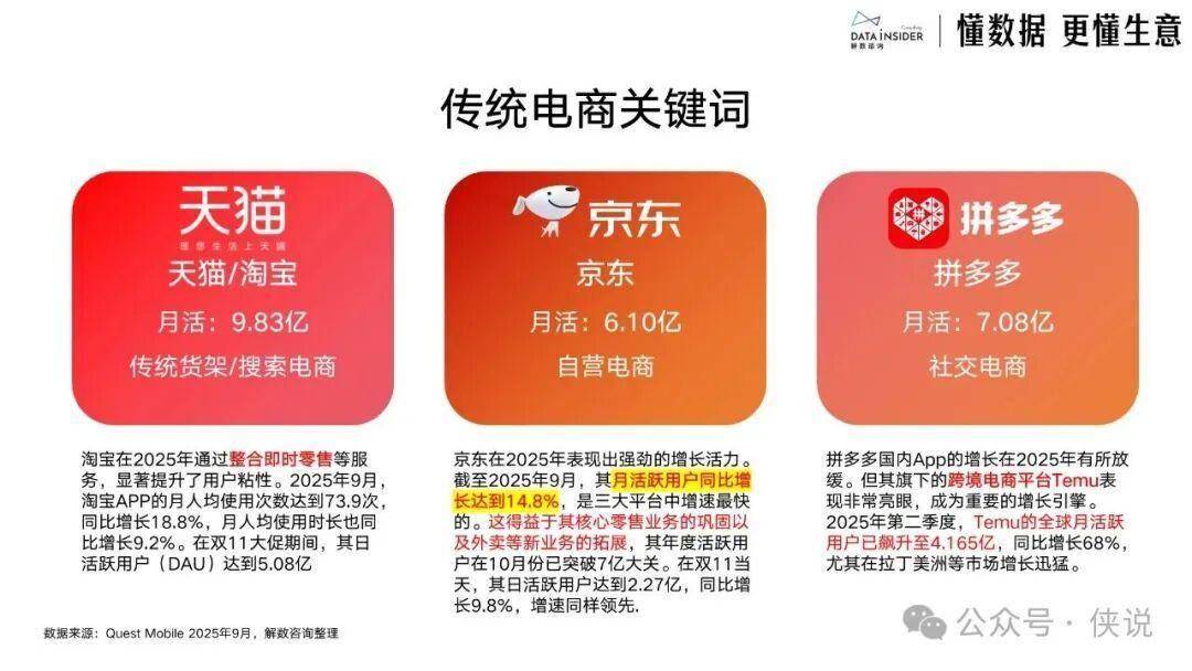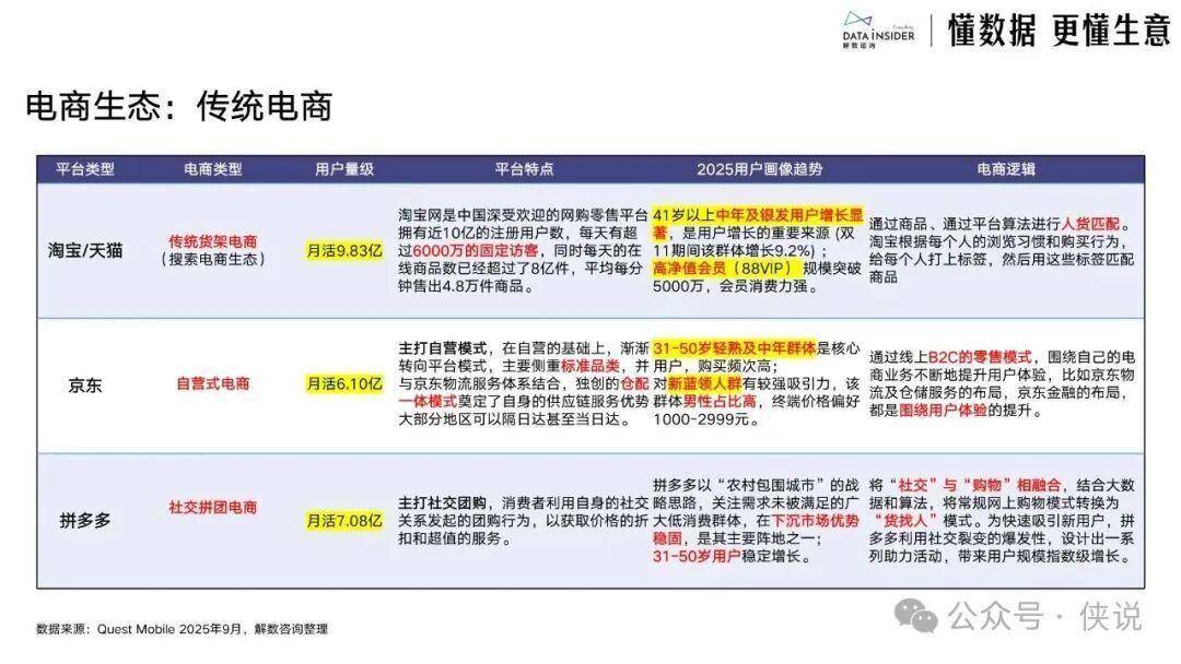 主流电商平台形成鲜明差异化定位:传统电商中,天猫/淘宝是品牌主阵地与价值堡垒,京东凭借超级供应链打造体验与效率优势,拼多多聚焦极致性价比与白牌爆款孵化;内容电商里,抖音以兴趣推荐实现“货找人”的爆发式增长,小红书成为消费决策起点与心智种草标杆,快手依托“老铁文化”深化信任电商价值。