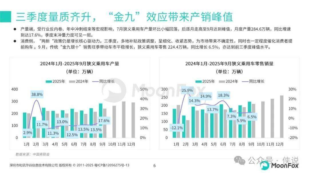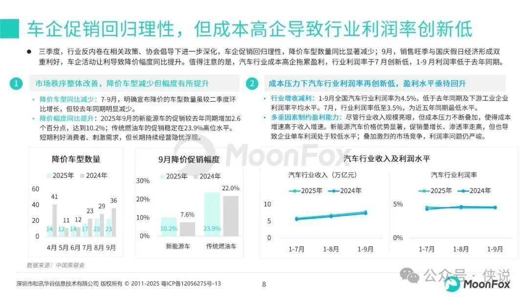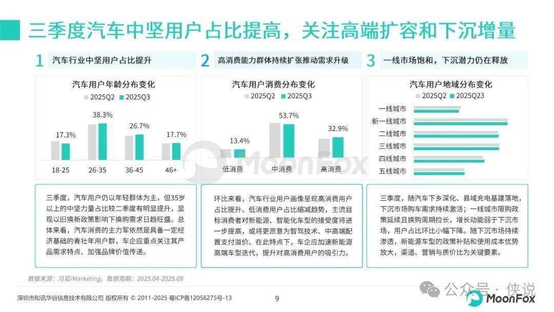 市场层面,行业呈现“增收减利”态势,1-9月利润率仅4.5%,低于去年同期及工业企业平均水平,成本压力与激烈竞争导致新能源汽车促销幅度达10.2%,传统燃油车促销维持23.9%高位。消费结构持续升级,高消费能力群体占比扩张,35岁以上中坚用户需求凸显,换购需求成为市场重要支撑,车企聚焦用户需求与品牌价值传递已成关键。