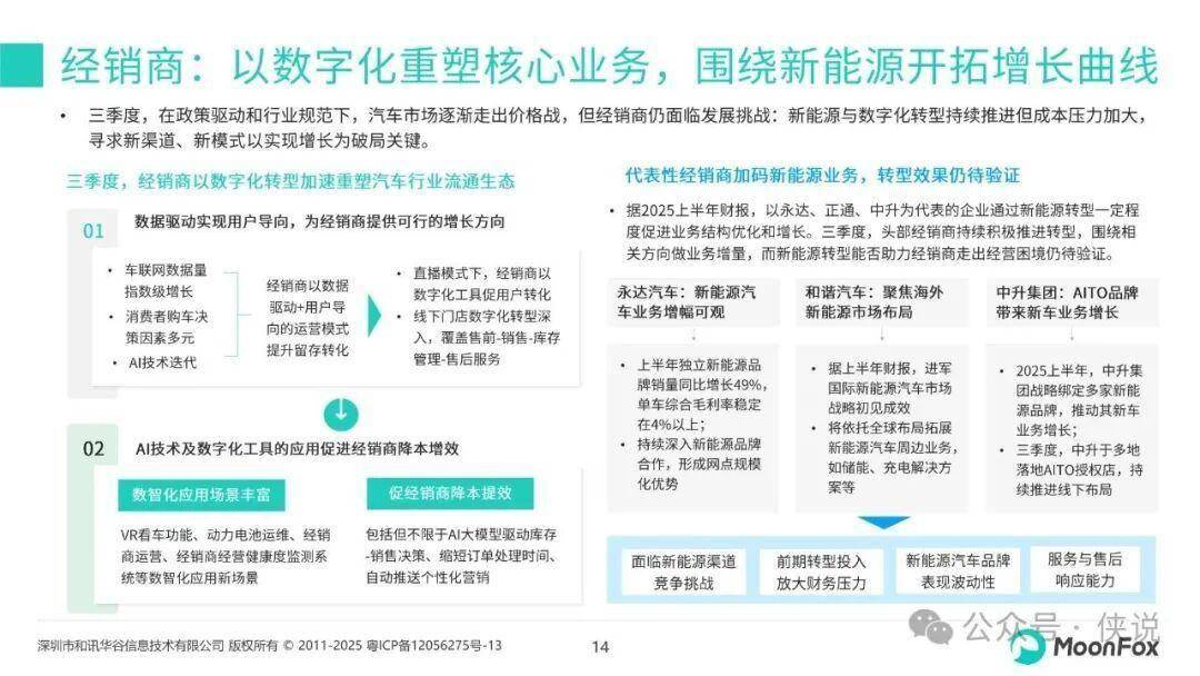 产业链各环节加速转型,经销商以数字化重塑核心业务,头部企业加码新能源布局;汽车养护行业聚焦技术赋能与渠道下沉,AI工具应用推动降本增效;汽车资讯平台凭借AI大模型、生态协同等强化竞争力,同时助力中国汽车品牌出海。整体来看,产业正围绕电动化、智能化、全球化加速迭代,为后续发展奠定基础。