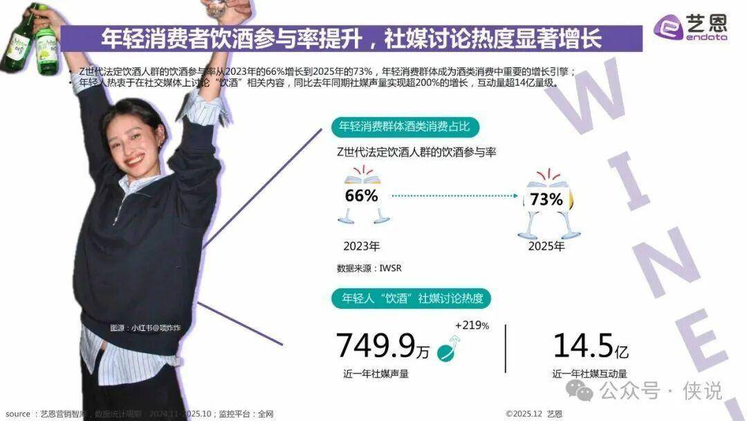 年轻人已成为酒类消费主力军,Z世代法定饮酒人群参与率从2023年的66%升至2025年的73%,社媒相关声量同比暴涨219%,互动量超14亿。