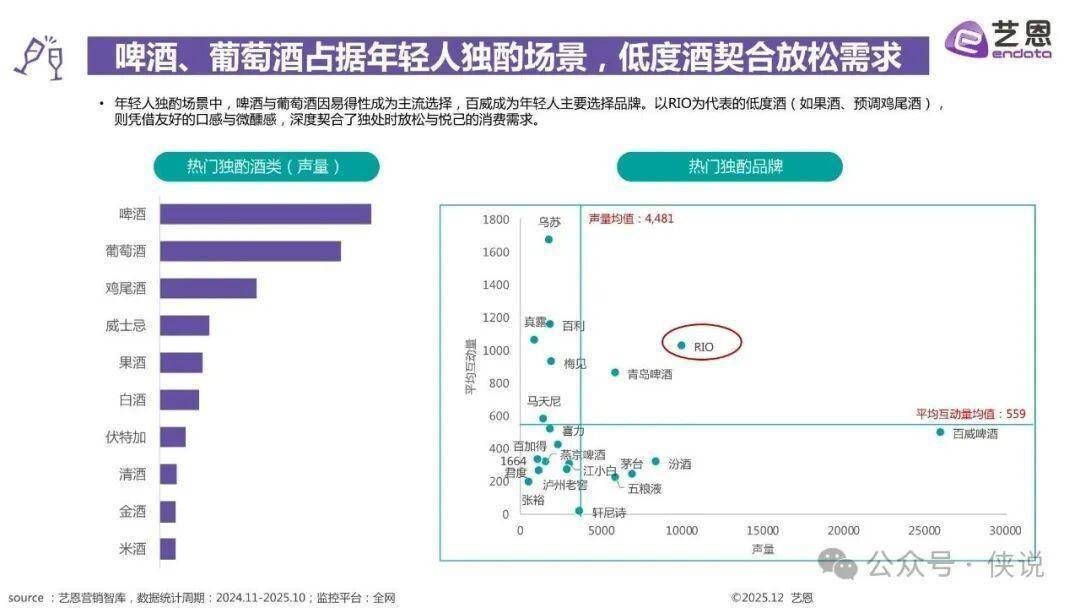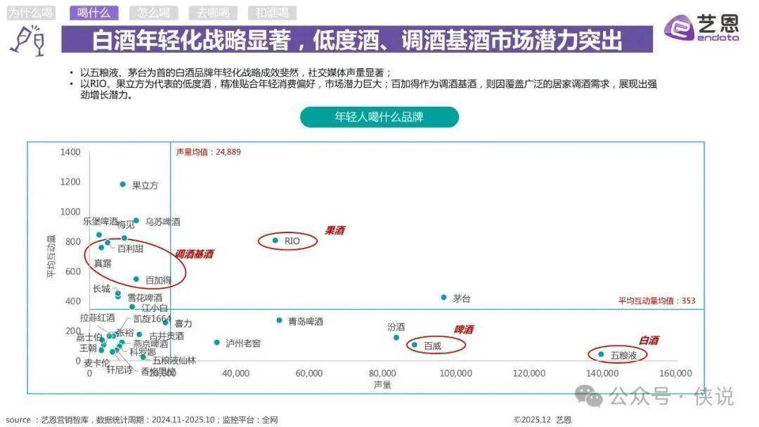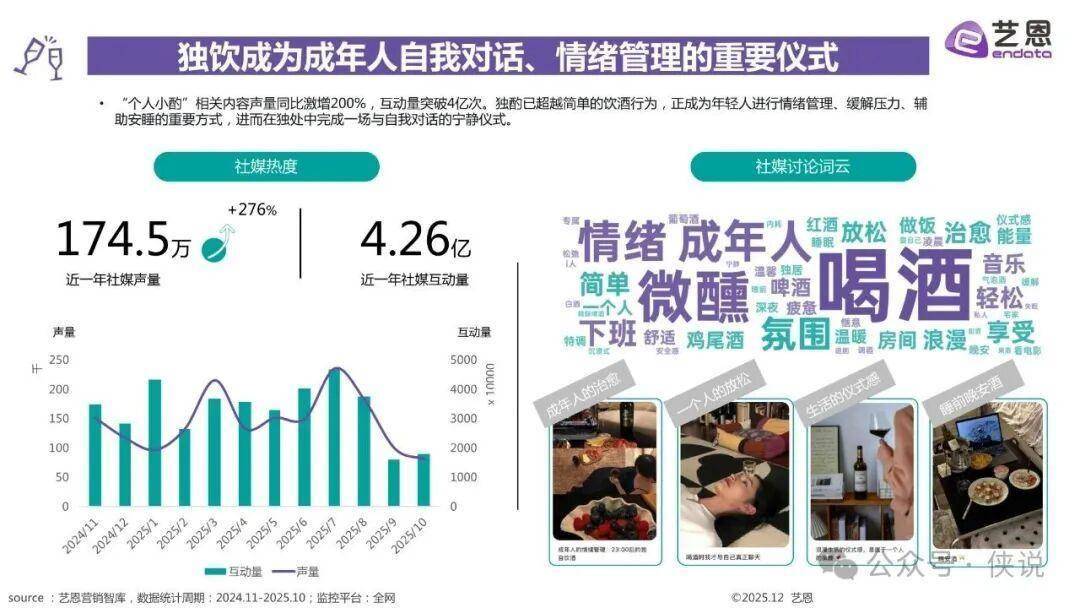 场景方面,家庭聚餐、朋友小聚是主流,个人独酌成为自我取悦的重要仪式,社媒声量同比激增200%,下班后和睡前是主要独酌时段。