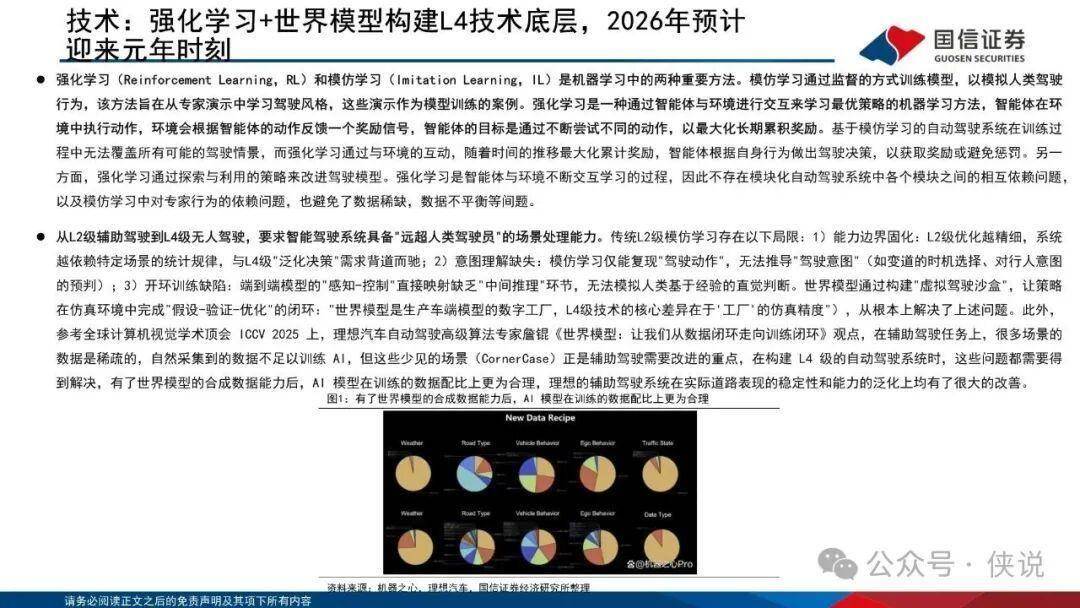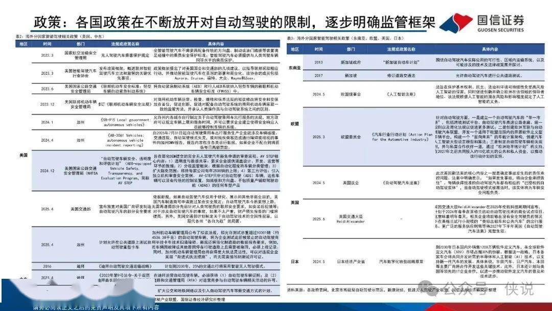 技术层面,强化学习+世界模型构建L4底层能力,解决传统模仿学习的场景覆盖局限;政策端,各国持续放开自动驾驶限制,中国、中东、欧洲处于全球领先梯队;成本端,L2/L2+级零部件成本下降,带动L4硬件成本降低。