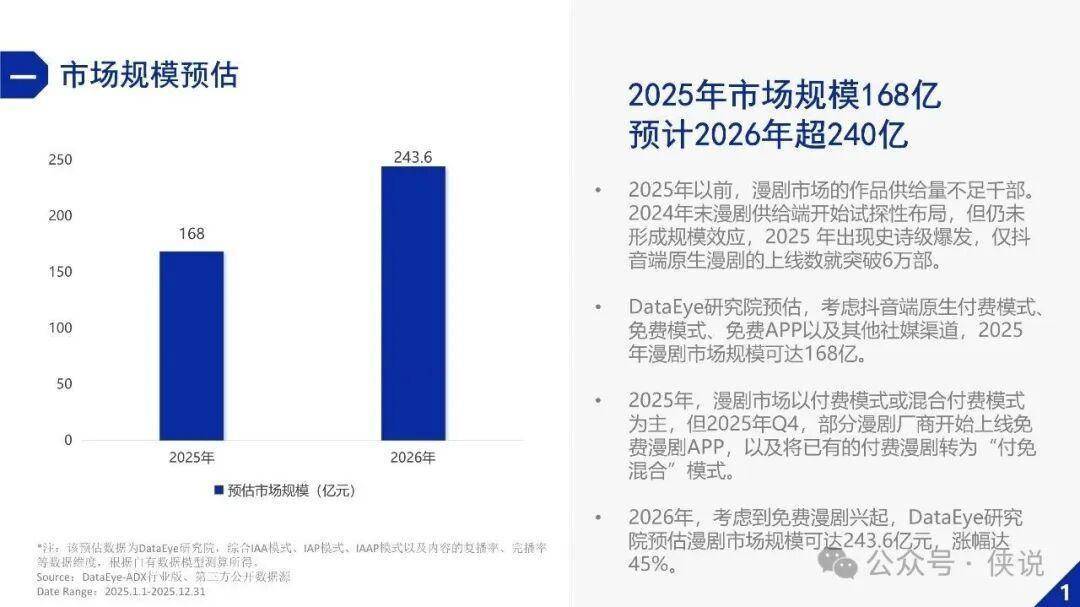 2025年成为漫剧行业爆发元年,市场呈现全方位增长态势。数据显示,2025年漫剧市场规模达168亿元,预计2026年将突破243.6亿元,涨幅高达45%。供给端迎来史诗级爆发,仅抖音端原生漫剧上线数就突破6万部,较此前实现量级跨越。