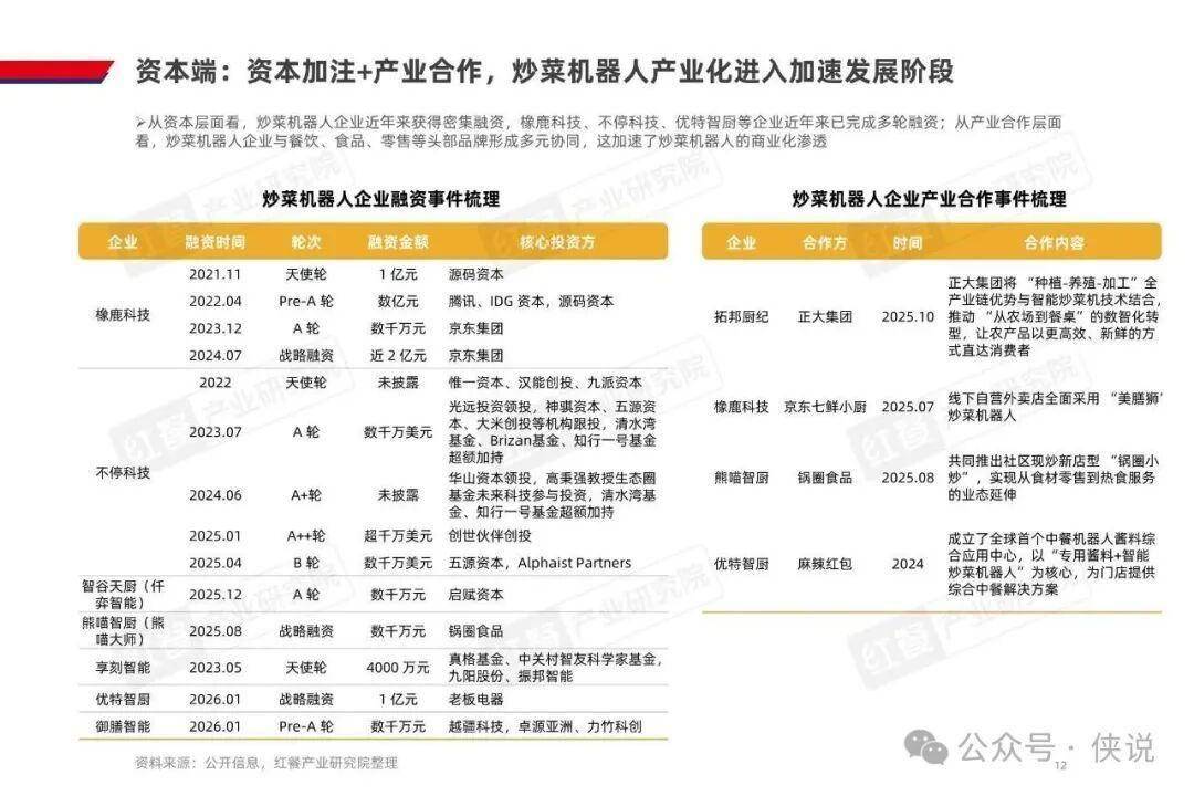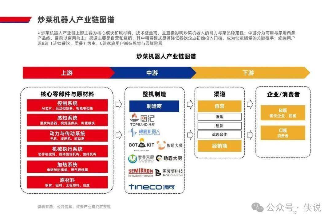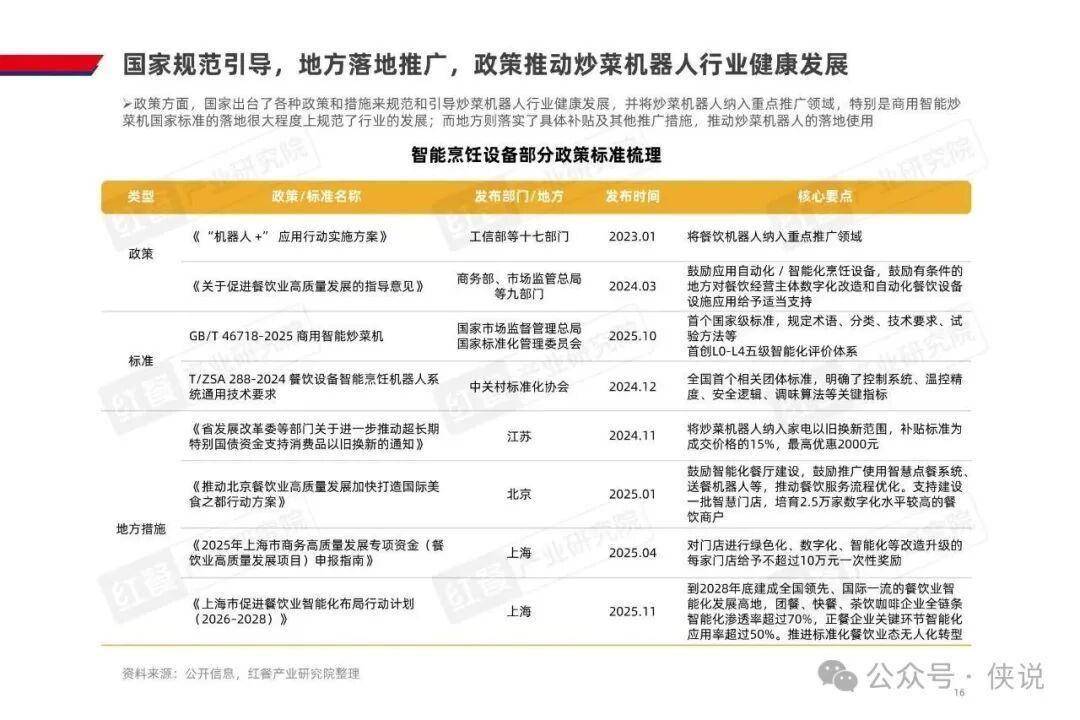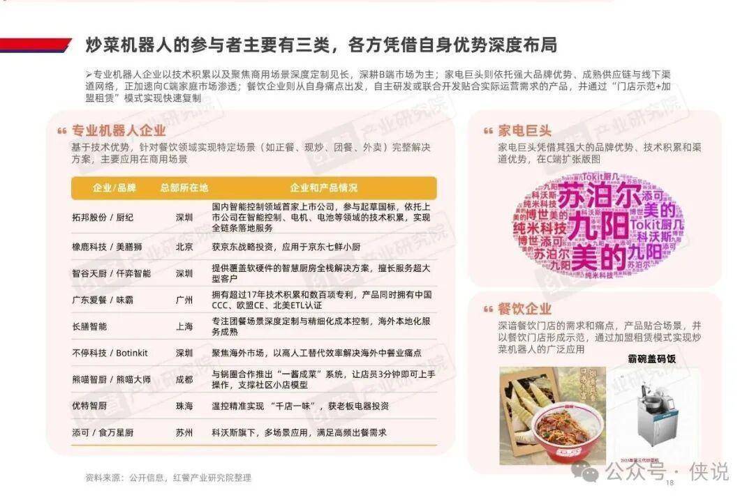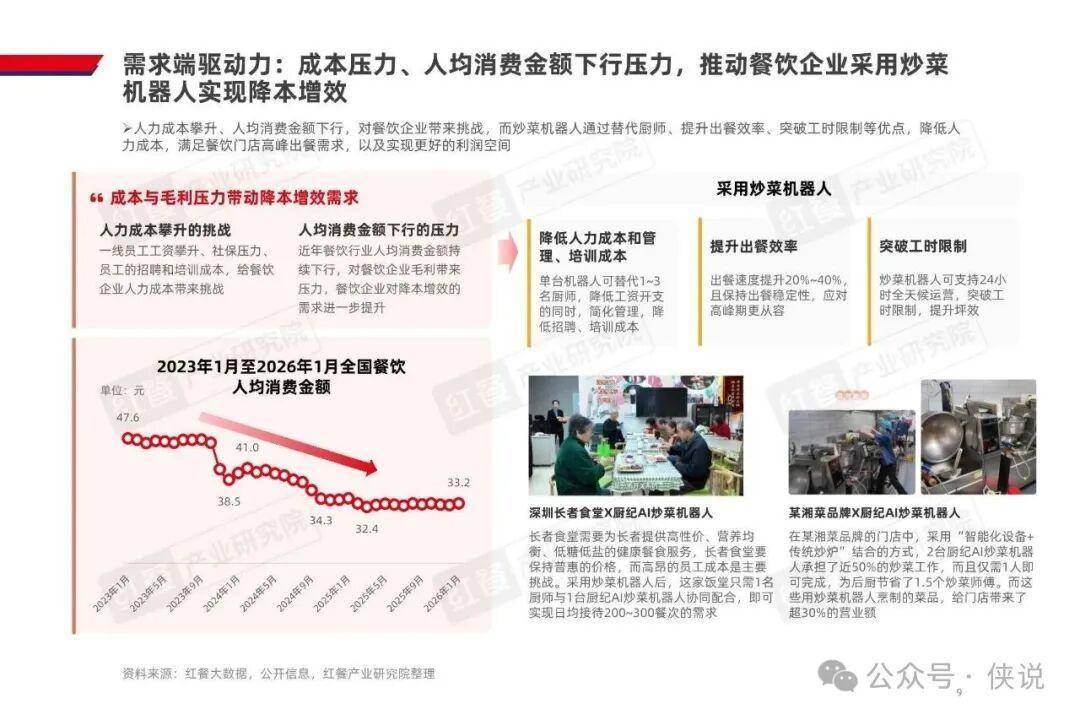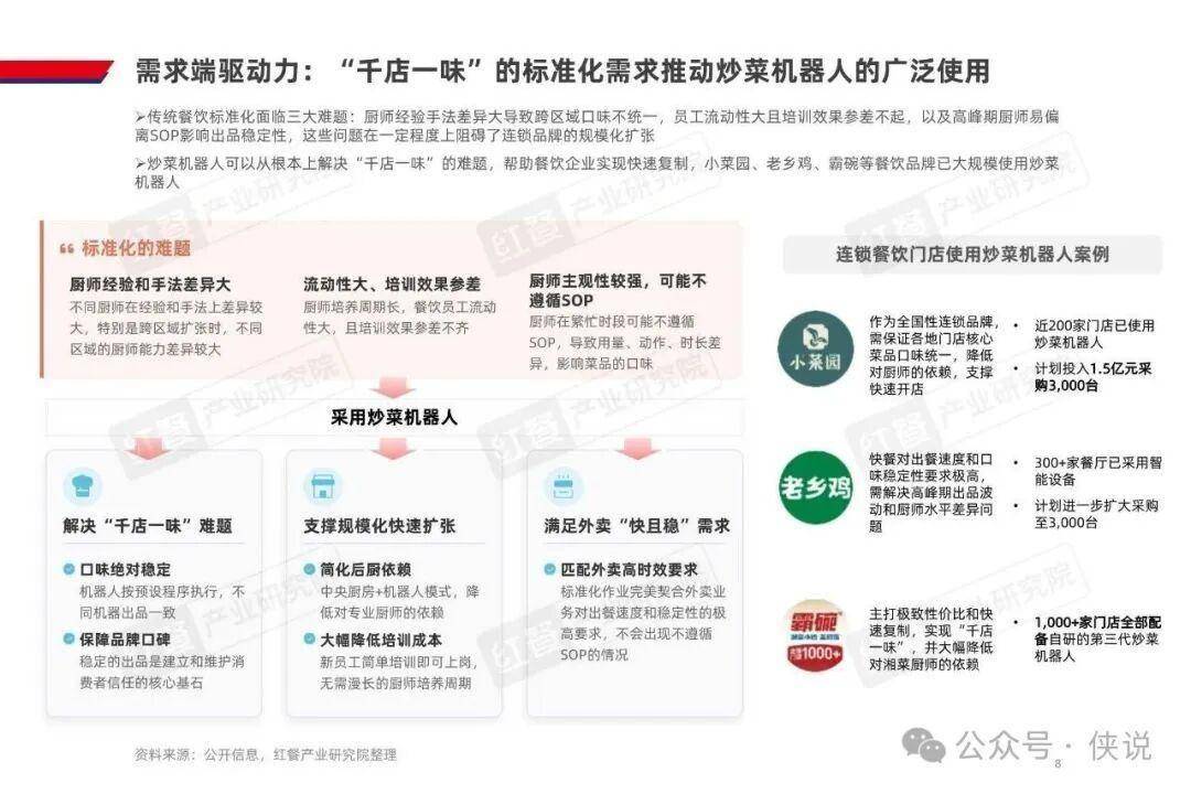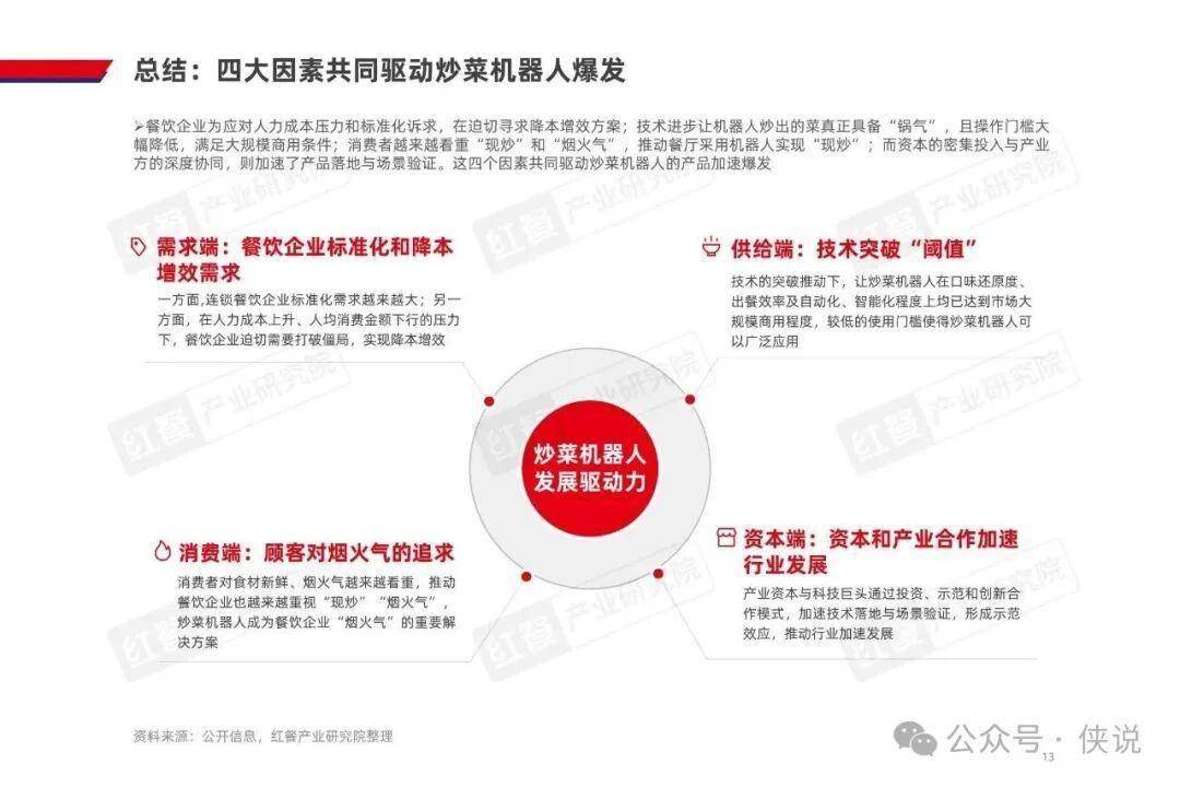 AI 炒菜机器人的商业化落地,源于多端需求的共同驱动。餐饮连锁化率提升对标准化提出更高要求,而人力成本占营收 22%、社保新规落地进一步推高用工成本,叠加人均消费下行,企业降本增效需求迫切;技术端实现温控、翻炒的锅气还原,自动化与智能化也大幅降低使用门槛,还能通过 AI 实时调整烹饪参数,解决传统人工炒菜的出品不稳定问题;消费者对现炒和烟火气的追求,也让机器人炒菜成为餐饮企业的重要解决方案;资本加注与产业合作加速,更是为行业发展注入动力。