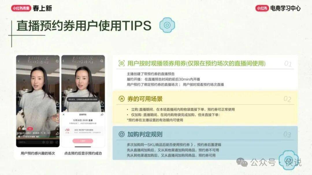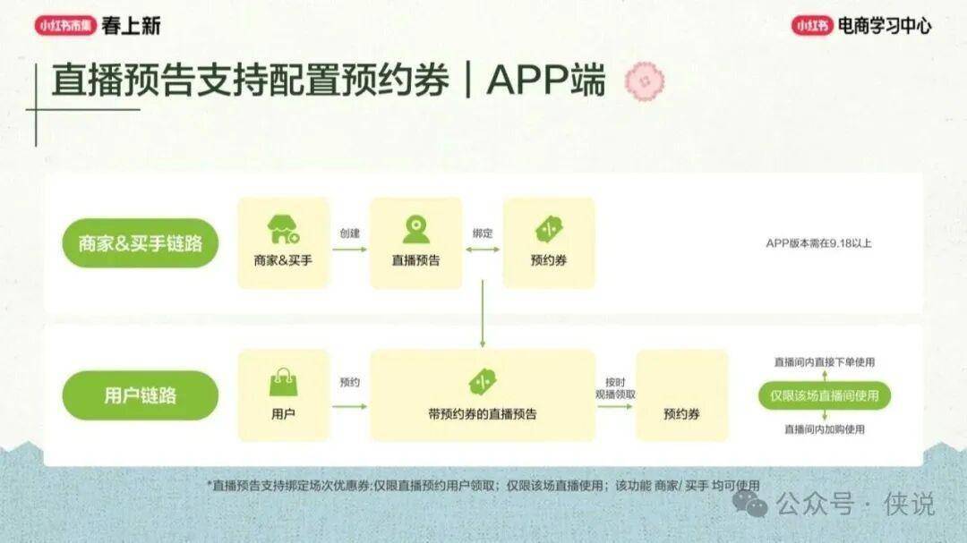 直播工具方面完成多维度升级,上线直播计划搭建工具与直播专场预约券工具。前者支持商家在千帆 PC 端完成选品备货、预热引流、进房承接全流程规划,AI 可辅助生成直播封面、标题及引流笔记,并自动在高活跃时段发布,同时以日历视图展示直播数据并给出优化建议;后者可在 APP 端绑定直播预告,仅预约用户可领取使用,明确了券的使用规则与加购判定逻辑,且预约场次能显著提升 GMV 与新客价值,平台还给出了预约组件挂载的实操建议,帮助商家更好锁定流量。