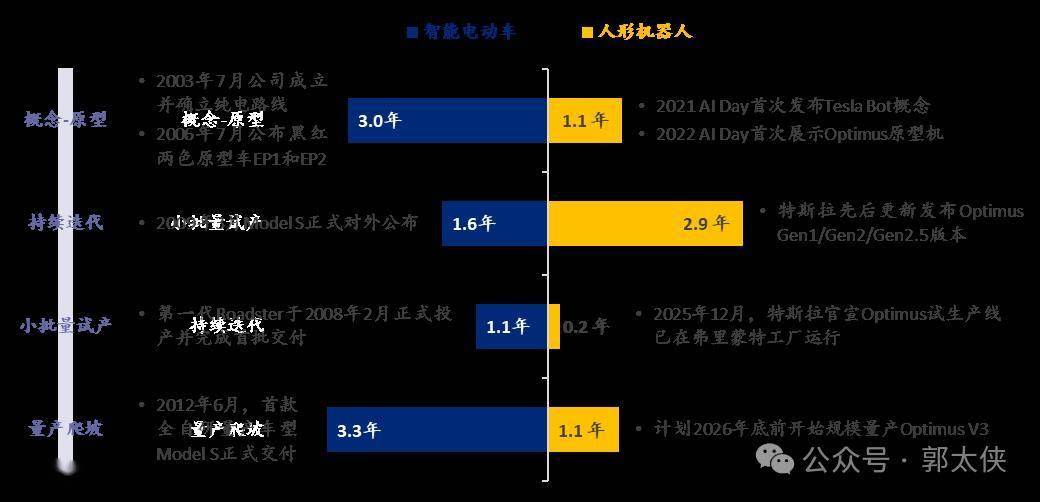 在电动车端,特斯拉从2003年成立到2008年交付首款车型Roadster,历时约5年完成概念确立及原型验证;在人形机器人端,2021年AI Day首次发布Tesla Bot概念,2022年原型机亮相,2026年计划量产,同样耗时约5年。