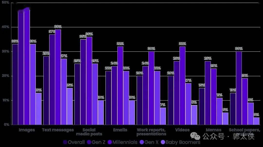 在AI应用场景方面:33%的受访者使用AI生成图片,28%用于撰写短信,25%用于创建社交媒体帖子。千禧一代在八项使用场景中的六项最为活跃,Z世代则在创作表情包和学校作业/项目方面领先。
