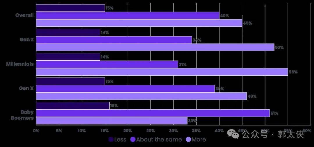 对于品牌使用 AI生成营销内容(图片、视频、文本),消费者态度呈现分化:28%感到负面,25%感到正面,36%持中立态度。Z世代和千禧一代的态度更为积极,32%表示正面,25%表示负面。