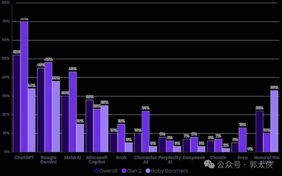 Z世代中70%使用过ChatGPT,是婴儿潮一代(34%)的两倍多。 Character AI在Z世代中的使用率达22%,而婴儿潮一代仅为3%。