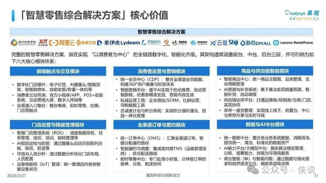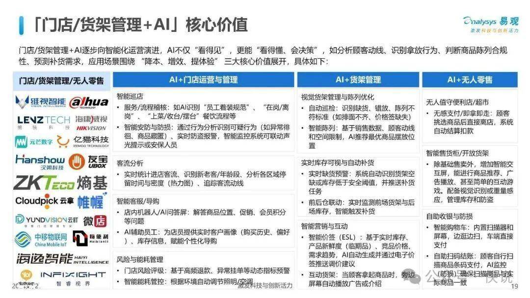零售应用层:智慧零售综合解决方案、AI产品设计、全渠道用户营销与运营、门店/货架管理/无人零售、AI商拍、数字人直播、支付/结算、仓储物流/供应链科技、数据洞察