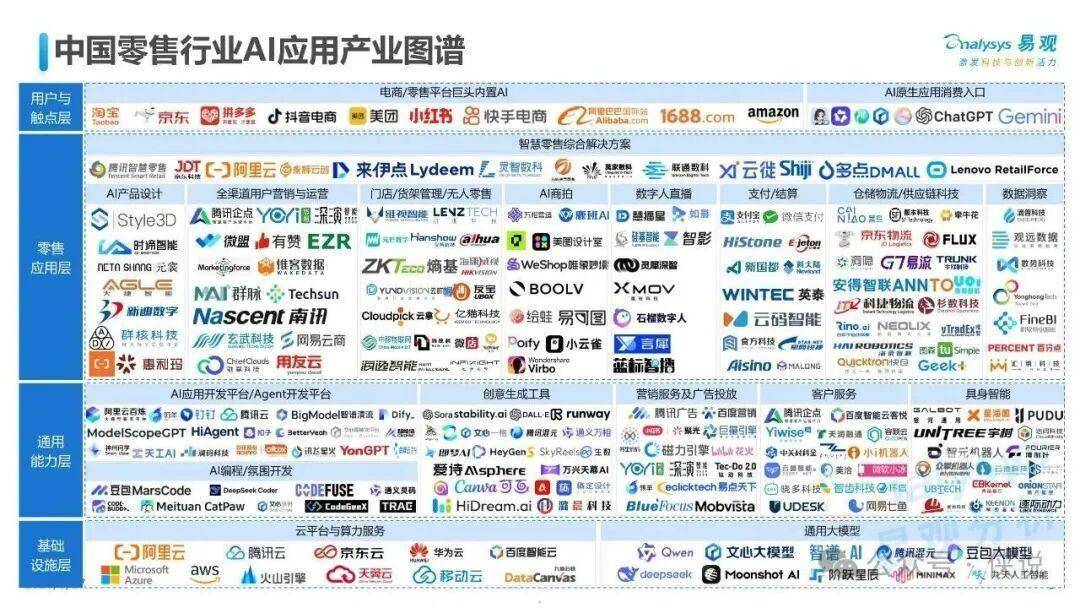 中国零售行业AI应用产业图谱可分为四大层级: