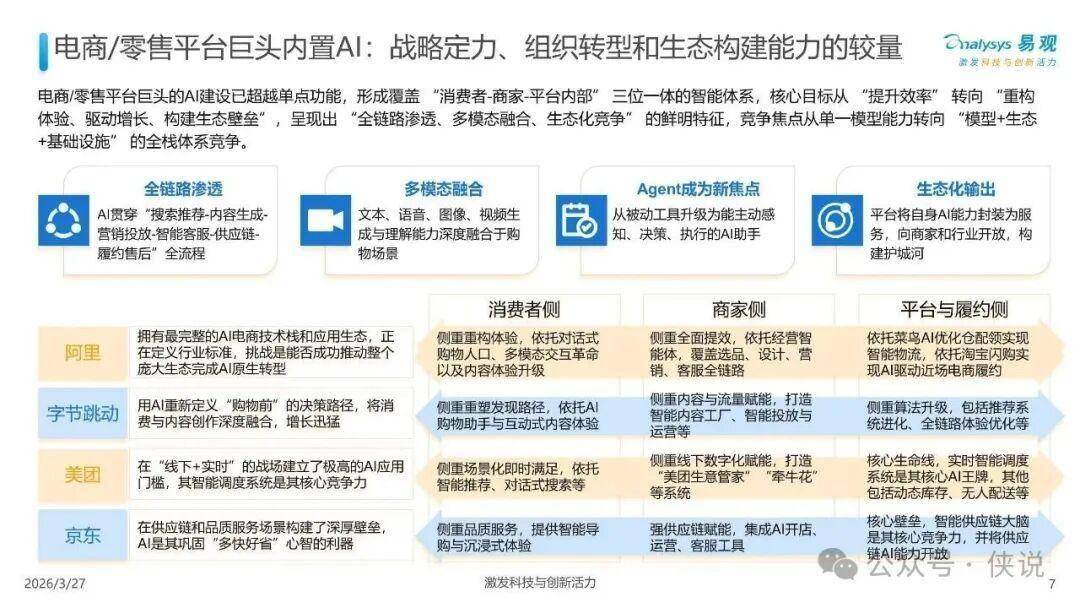 阿里:拥有最完整的AI电商技术栈和应用生态,正定义行业标准。侧重对话式购物、多模态交互革命,依托菜鸟AI优化智能物流。