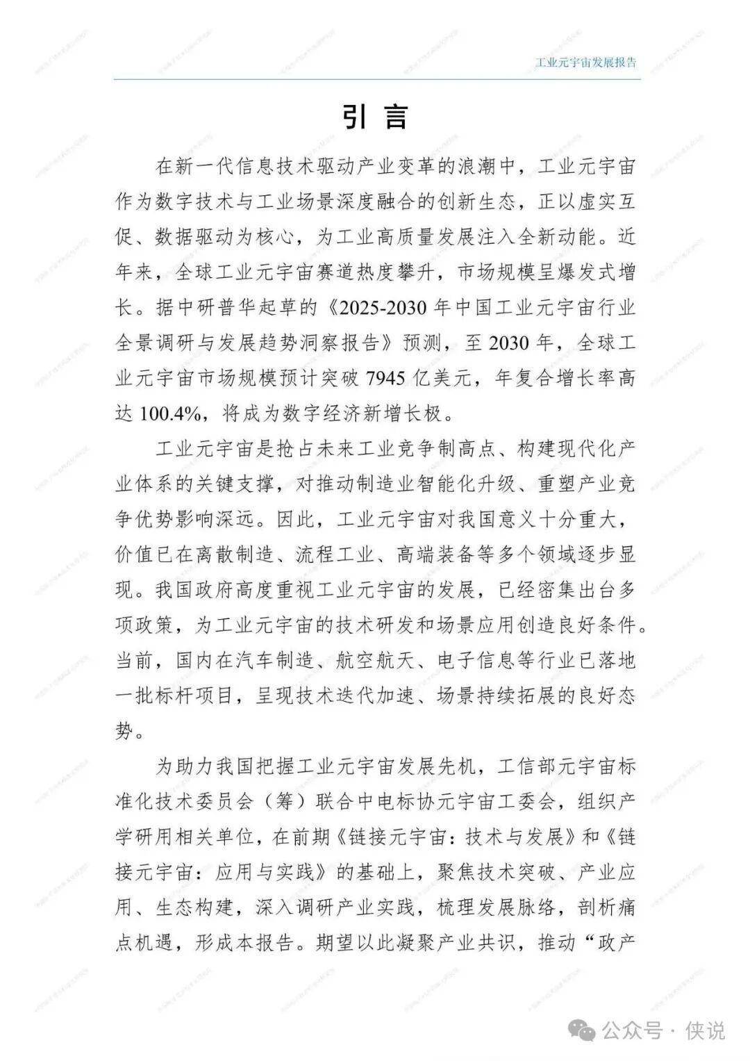 报告明确,工业元宇宙是数字技术与工业深度融合的新型生态,以虚实融合、数据驱动、智能协同、沉浸式交互为核心特征,贯穿工业全流程、全要素、全价值链。当前全球赛道快速升温,预计 2030 年全球市场规模突破 7945 亿美元,我国已在汽车、航空航天、能源等领域落地标杆项目,步入场景规模化落地关键期。